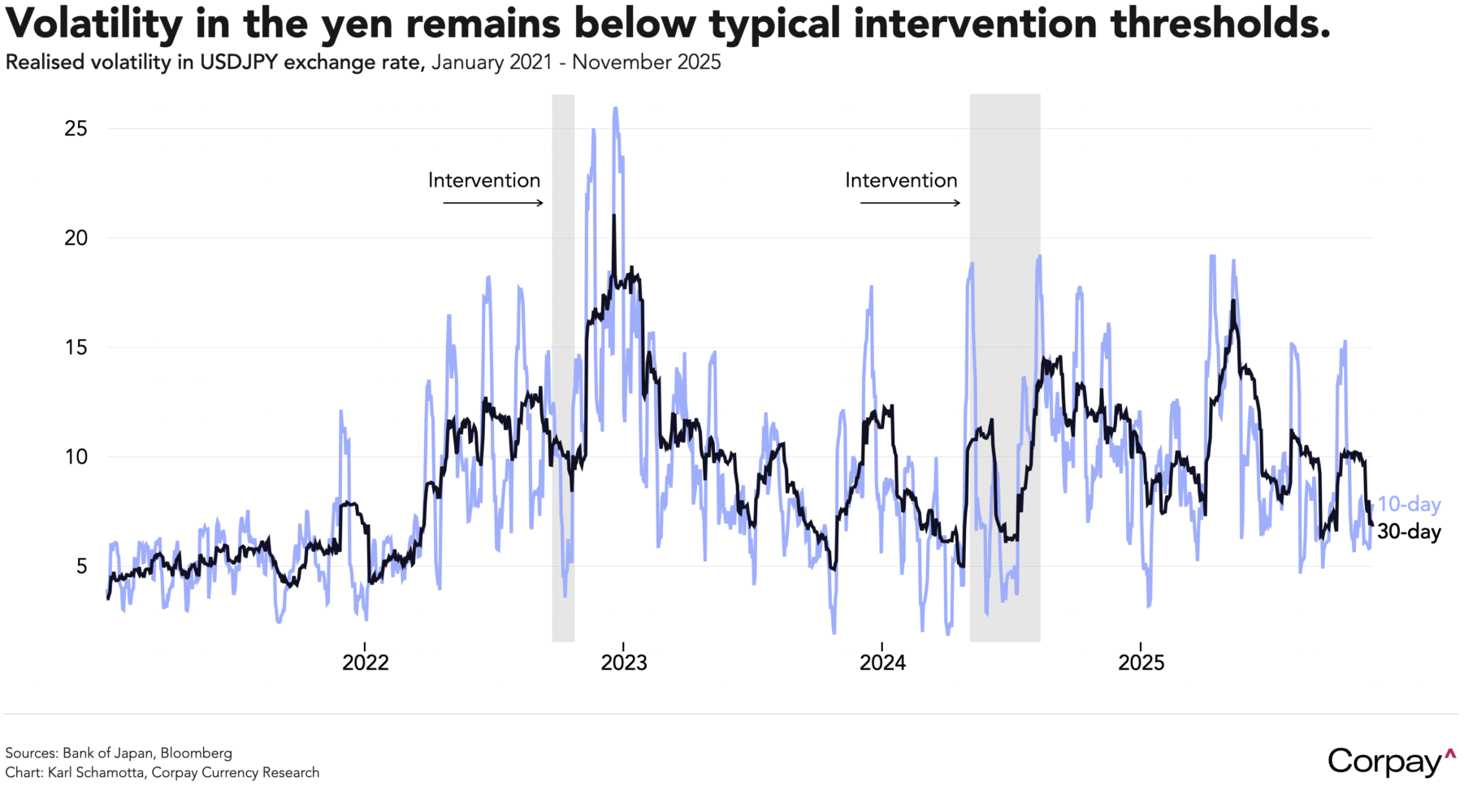 Across the Pacific, the Japanese yen is trading with a slightly firmer bias as market participants hedge themselves against a possible intervention effort during the Thanksgiving holiday. The Ministry of Finance and Bank of Japan have learned to use thin liquidity conditions—the “witching hours” between the North American close and the Asia open, or market holidays—to maximise the impact of their yen-buying efforts in recent years, and investors are wary of something similar playing out in the days ahead. We can’t discount the possibility—from a technical standpoint, the yen looks vulnerable here—but realised volatility remains well below the levels that have preceded intervention efforts historically, and would also note that the central bank’s tightening trajectory represents an upside possibility in the months ahead. To an unusual extent, there are significant two-way risks embedded in the yen here.