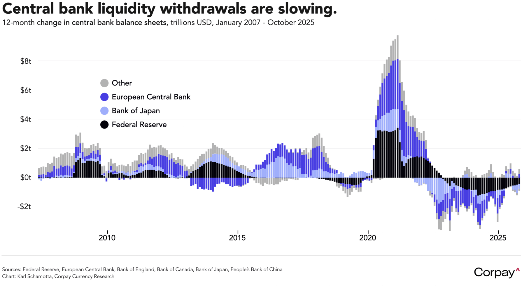 In theory, today’s Fed decision shouldn’t cause much turbulence. Markets are overwhelmingly positioned for a quarter-point rate cut, and a quarter-point cut will almost certainly be delivered. But investors also expect a dovish trifecta: additional committee members joining Trump-appointed Stephen Miran in dissenting in favour of a larger cut; Chair Powell signalling that another reduction remains on the table for December; and the central bank announcing a halt to quantitative tightening—a process that has shaved roughly $2.4 trillion off its balance sheet in the past three years. In practice, a repeat of September’s dynamic—signs of unity across the committee, a cautious tone from Powell, and a more nuanced approach to liquidity management—might generate a small dollar rally.