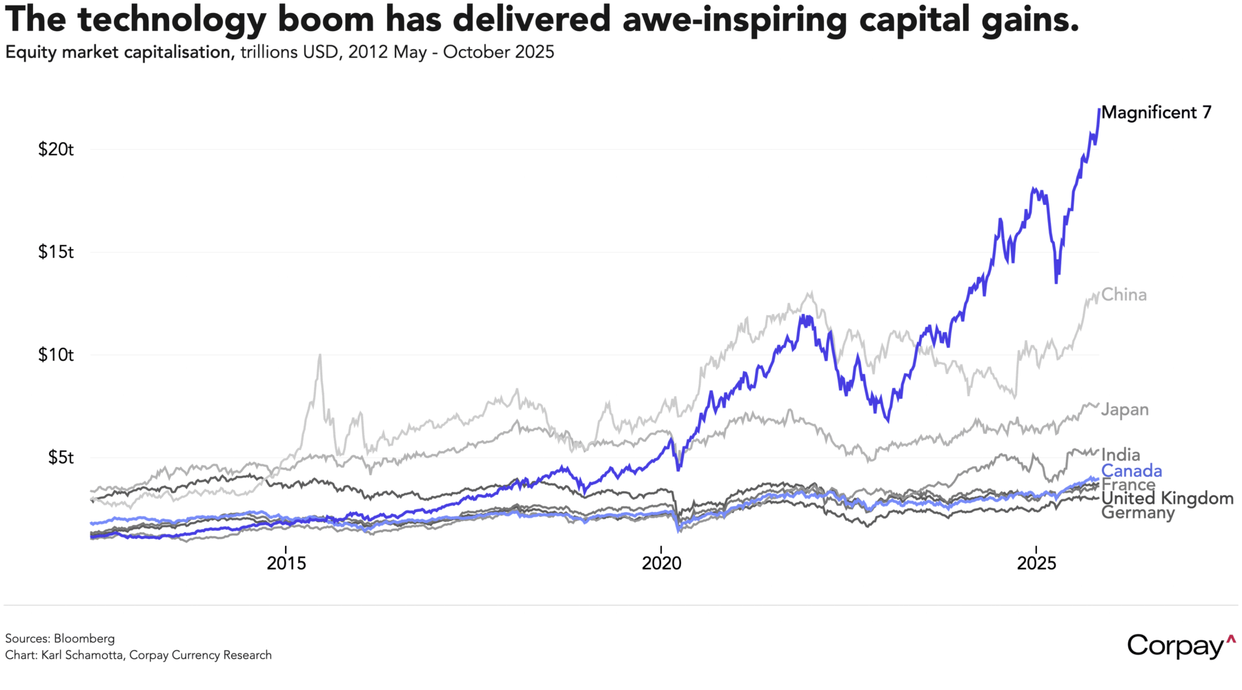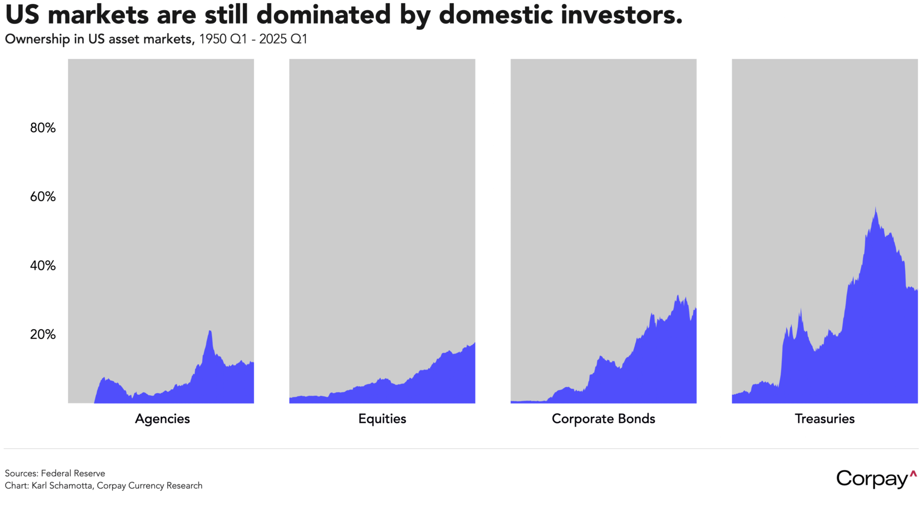 A reversal—if one comes—could hit the United States hardest. In the early stages of any correction, “dollar-smile” dynamics would likely assert themselves—US markets remain unrivalled as a safe haven, and the greenback should initially benefit. But that strength may prove fleeting. Foreign participation in American capital markets remains relatively limited, and the wealth effect from surging asset prices has been a crucial driver of domestic consumption. If the boom were to falter, a repeat of April’s abrupt dollar sell-off would be far from inconceivable.