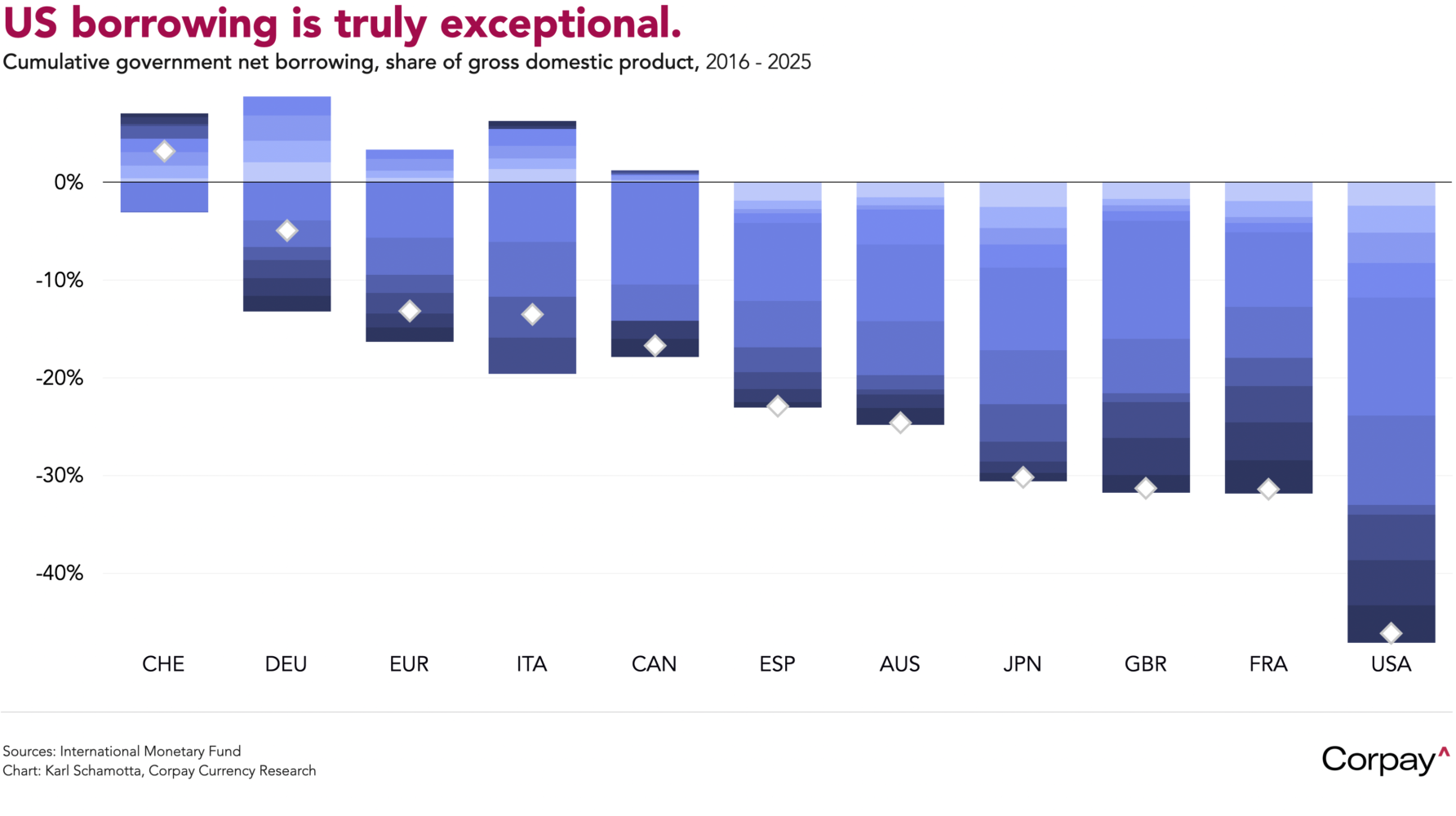 *Alexis de Tocqueville reputedly said, “The American Republic will endure until the day Congress discovers that it can bribe the public with the public’s money,” but Congress found it could bribe the public with borrowed foreign money instead. This has underpinned US exceptionalism for decades, but may not last forever—as Margaret Thatcher observed, “The problem with Socialism is that you eventually run out of other people’s money.”