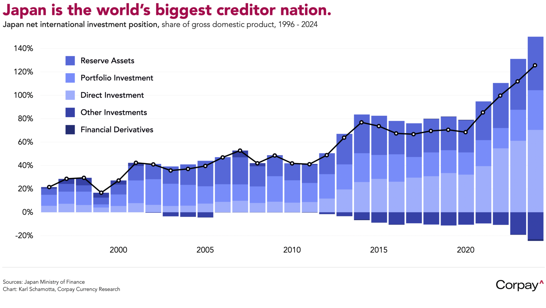 This matters enormously for currencies because of Japan’s unique structural position. After running current-account surpluses for decades, Japan has emerged as the world’s largest creditor nation, with a net international investment position that has grown to an all-time high as a share of gross domestic product—the total value of financial assets held by Japanese investors abroad far exceeds the value of Japanese assets held by foreigners. Many segments of the economy are running what are, in effect, short-yen, long-dollar positions, meaning as domestic yields rise and growth improves, repatriation flows could begin to build. Political clarity and a stronger outlook may also attract foreign capital. A yen recovery—paired with an attendant decline in asset prices elsewhere—cannot be ruled out.