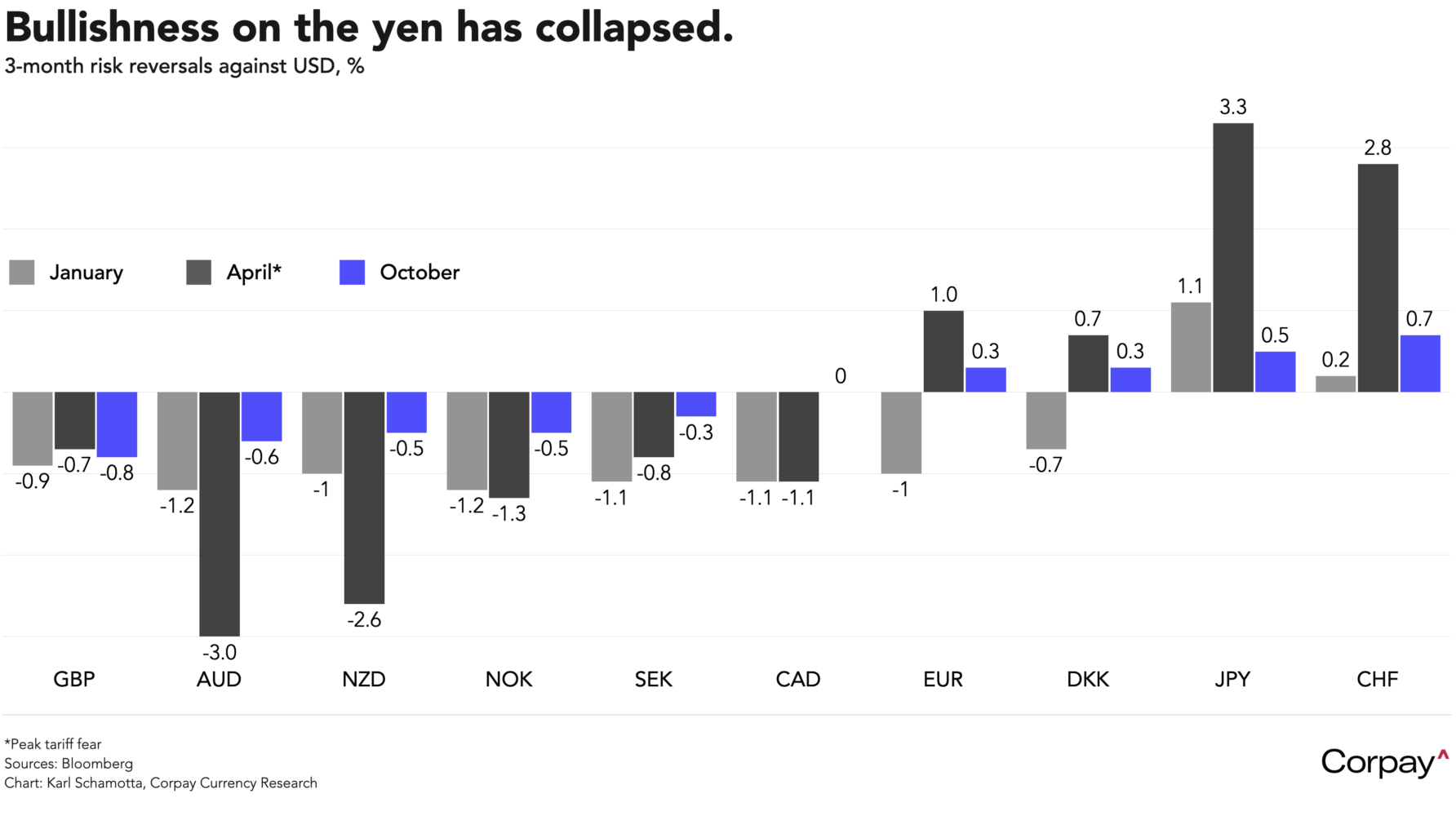 Options markets have turned far less optimistic on the yen’s prospects. So-called “risk reversals”—which measure the gap between prices for put options which give the holder the right to sell yen and buy dollars three months from now, and calls that confer the opposite privilege—have declined dramatically from levels reached in April as prospects for monetary tightening have faded. We think that this is reasonable: structural impediments mean the yen is likely to remain the world’s preferred carry funding currency for some time yet. However, we also suspect public hostility to rising prices is likely to constrain deficit-funded government largesse and limit Takaichi’s sway over the central bank in the near term, meaning that the currency could recover a little ground in the coming days.