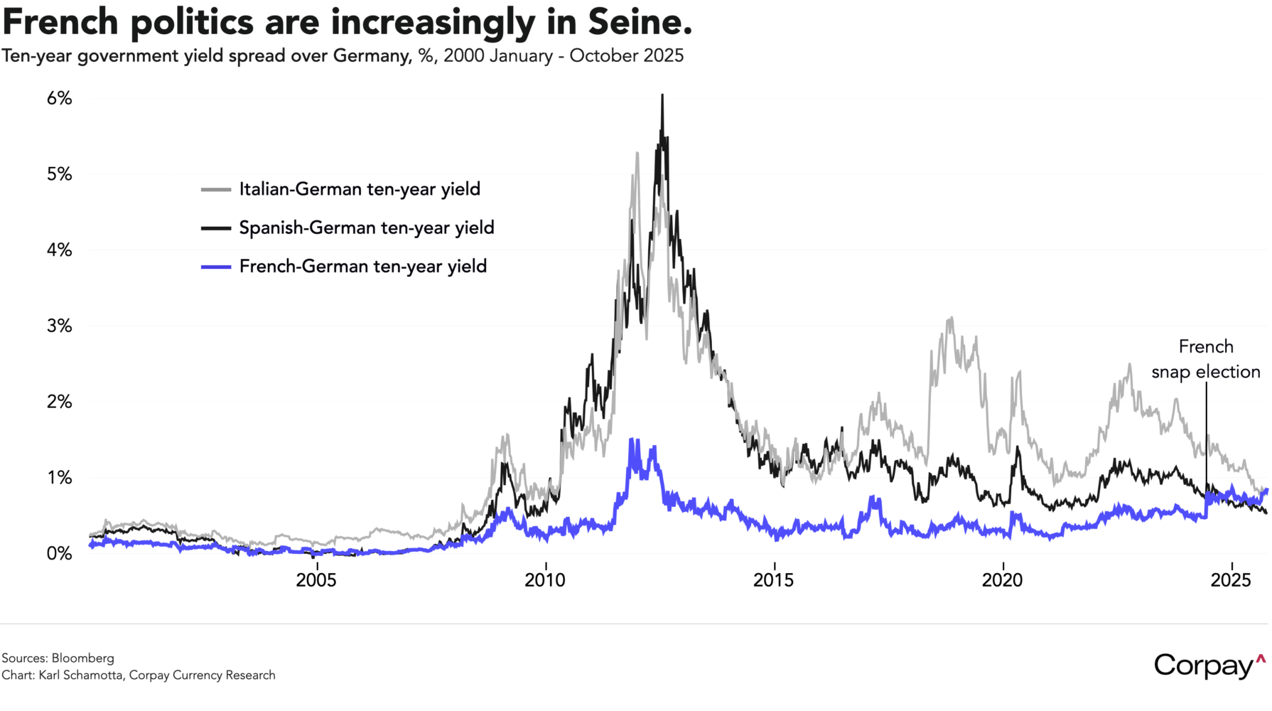 The euro is trading roughly 0.7 percent lower after French prime minister Sebastien Lecornu resigned less than a month* after his appointment. Lecornu—the third prime minister to leave office since President Emmanuel Macron called disastrous snap parliamentary elections last summer—chose to step down after foes and allies alike vowed to vote down his government, saying “One cannot be prime minister when the conditions are not met”. From here, Macron could appoint yet another caretaker prime minister, resign, or announce new legislative elections—opening up the possibility of a swing toward the far right, and enhancing the risk that the country’s fiscal issues continue to worsen. The interest rate gap between French government bonds and German bunds—a widely-watched measure of market stress—has widened to its highest levels since the eurozone debt crisis, and now exceeds spreads in Italy and Spain.