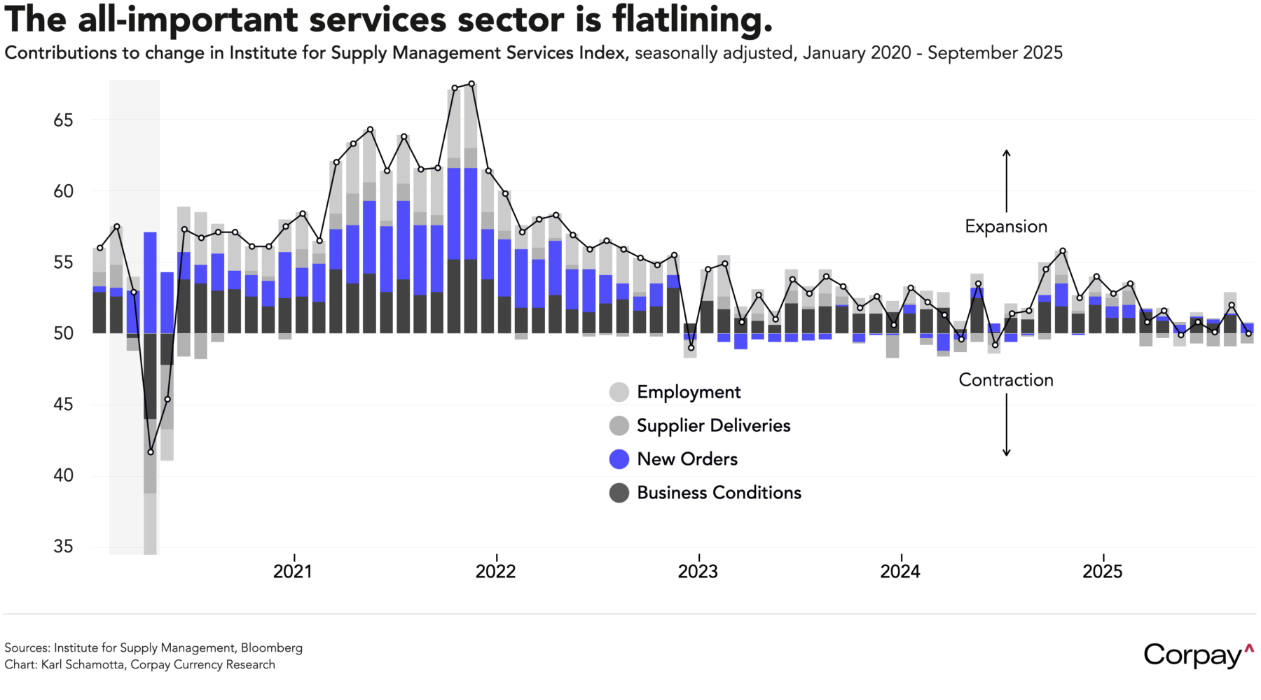 We doubt the shutdown itself will take a dramatic fundamental toll, but the psychological impact could prove quite damaging. According to an update published on Friday, the Institute for Supply Management services index—which measures activity in the biggest sector in the American economy—tumbled toward contractionary territory in September, with the business activity subindex falling well into negative territory for the first time since the pandemic in 2020. Respondents pointed to continued supply chain challenges, tariffs, and heightened policy unpredictability as contributing to the slowdown—factors that could worsen as dysfunction in Washington becomes more evident.