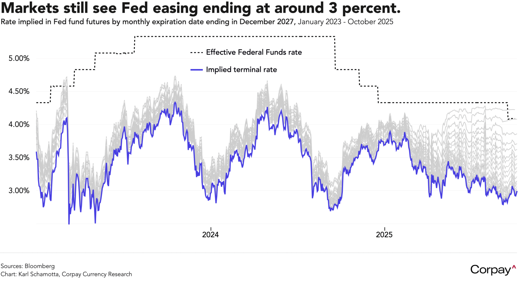 With official data on the US economy likely to remain unavailable this week, investors will turn their attention to what policymakers have to say on the monetary outlook. By our count, members of the Federal Reserve’s rate-setting committee are slated to make at least eighteen public appearances in the coming days, with their comments—along with Wednesday’s minutes from the September meeting—shedding light on just how isolated recently-appointed Governor Miran’s dovish stance really is. We think the balance of risks around the minutes is tilted in a hawkish direction: at the time of the meeting, hiring had undoubtedly slowed, but a number of economic indicators were showing signs of improvement, and the record will likely indicate that “most” participants remained sceptical of Miran’s contention that the “neutral rate” had fallen sharply under Trump. For now, markets are pricing in an eventual “terminal” Fed Funds rate close to 3 percent, up from levels expected ahead of the president’s latest round of attacks on the Fed’s independence.