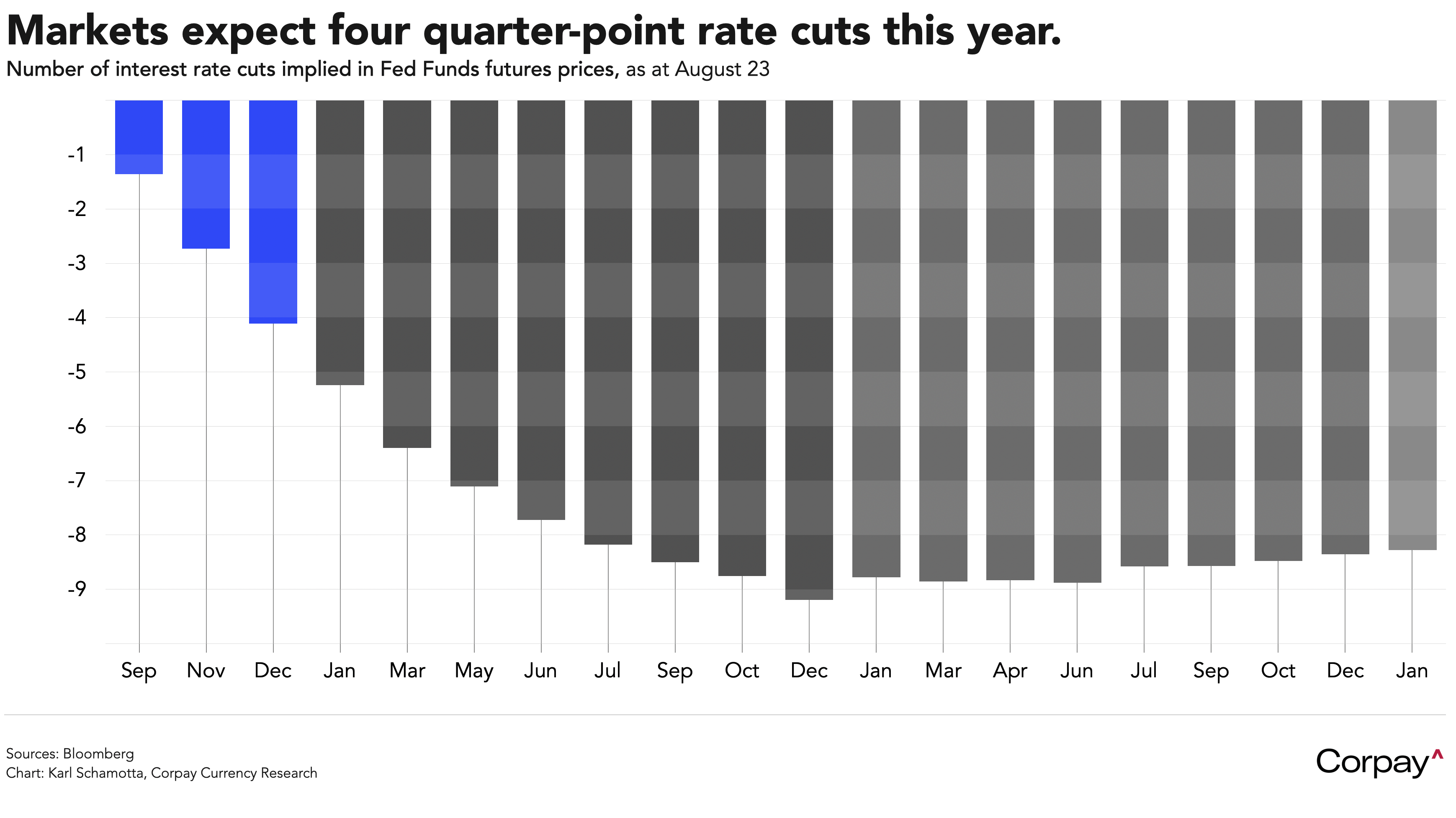 The dollar is down incrementally, Treasury yields are slightly lower on the front end, and equity indices are advancing as traders incrementally lower the odds on a plus-sized rate cut at the September meeting. Roughly 100 basis points in easing are priced in by the end of December, suggesting that markets remain convinced an economic slowdown will ultimately translate into at least one half-percentage-point move.