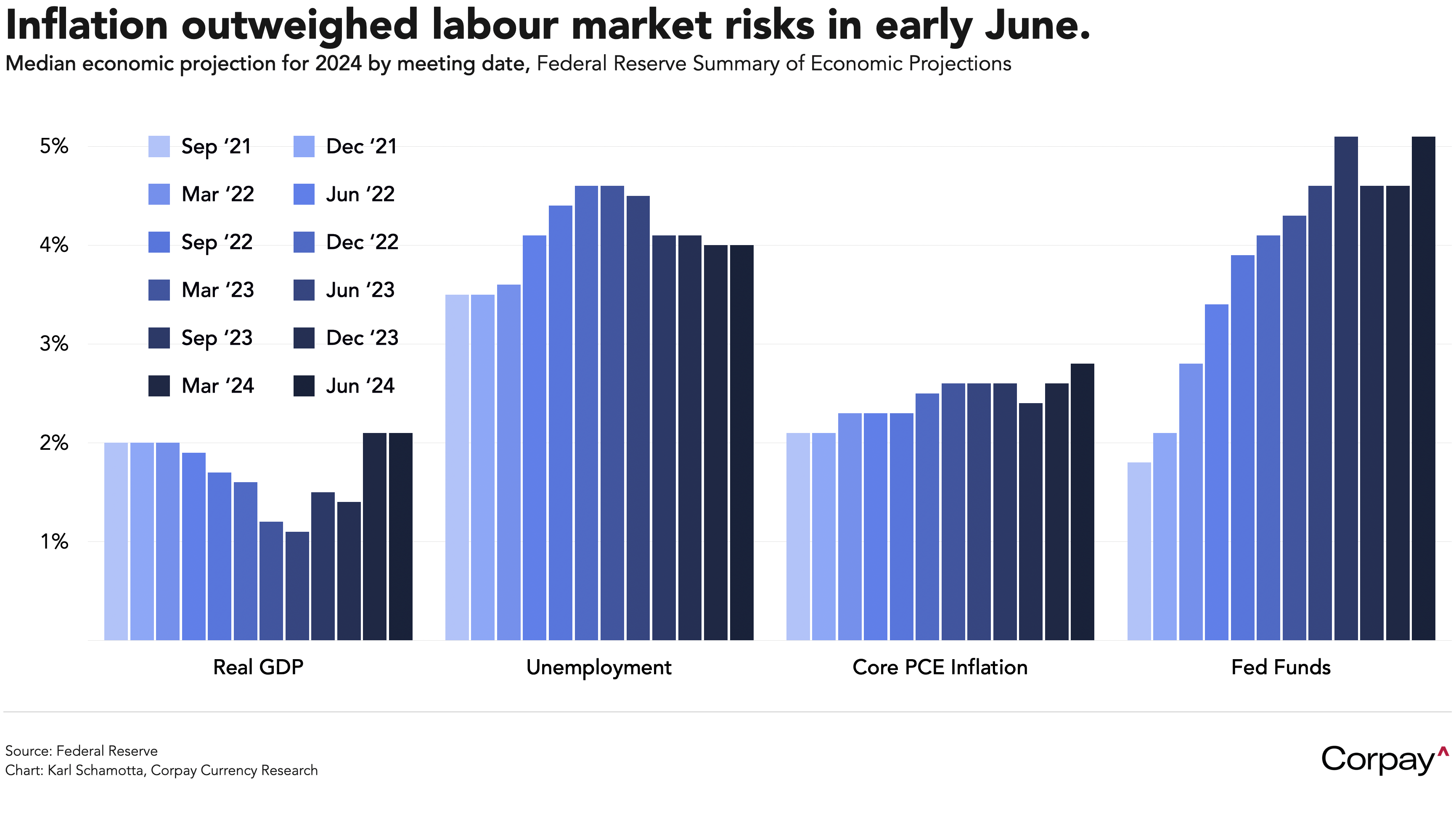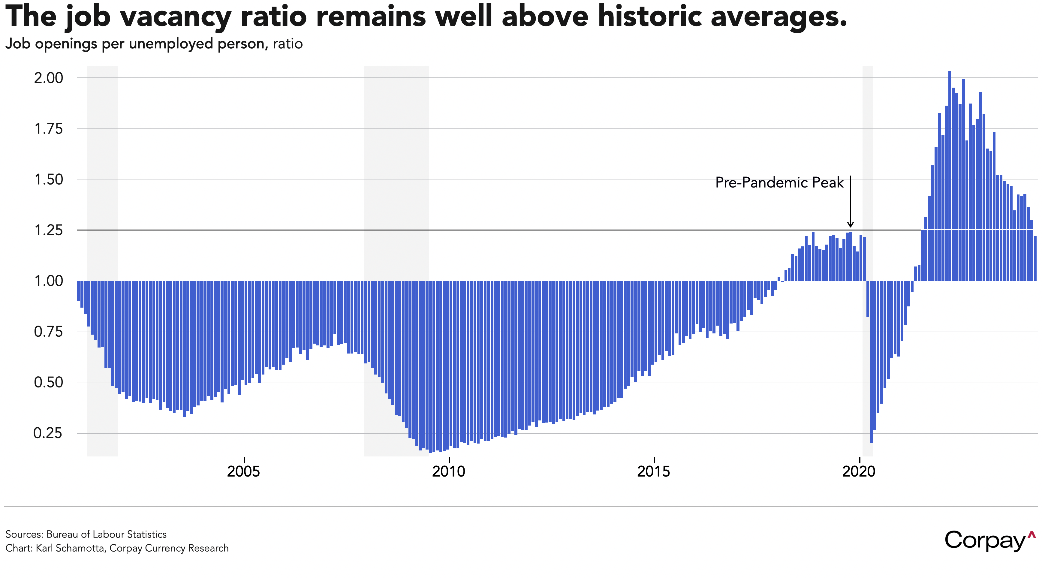 The correction was limited, however, as stronger-than-anticipated job opening numbers offset the impact on rate expectations. The May Job Openings and Labor Turnover report showed the number of vacant positions jumping back to 8.14 million from a revised 7.92 million in the prior month, separations remaining steady, and the quits rate holding at 2.2, suggesting that workers felt fairly confident in their alternative employment prospects. The ratio of job openings to unemployed workers fell below the pre-pandemic peak, but remained well above historical norms.