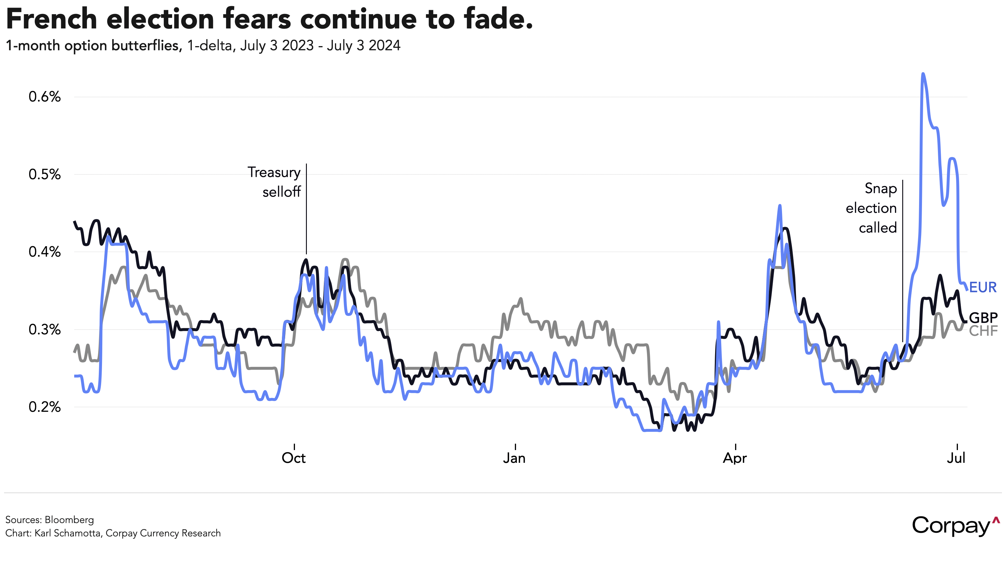 Fear levels surrounding this weekend’s French legislative election are plunging as rival parties work to deny the far-right National Front a majority. Between Emmanuel Macron’s coalition and the left-wing New Popular Front, at least 215 candidates have withdrawn from three-way “triangulaire” races in an effort to ensure that vote splits don’t inadvertently bolster right-leaning candidates, and most indications suggest that this will be successful: the odds on Marine le Pen’s party winning an outright majority in the 577-seat National Assembly are diminishing by the hour. The gap between French and German ten-year bonds has narrowed to levels last hit in early June, and the premium paid to enter “butterfly” option strategies – which can be used to hedge extreme moves – has fallen sharply, suggesting that traders are less concerned about a dramatic move in the currency’s value relative to the dollar.