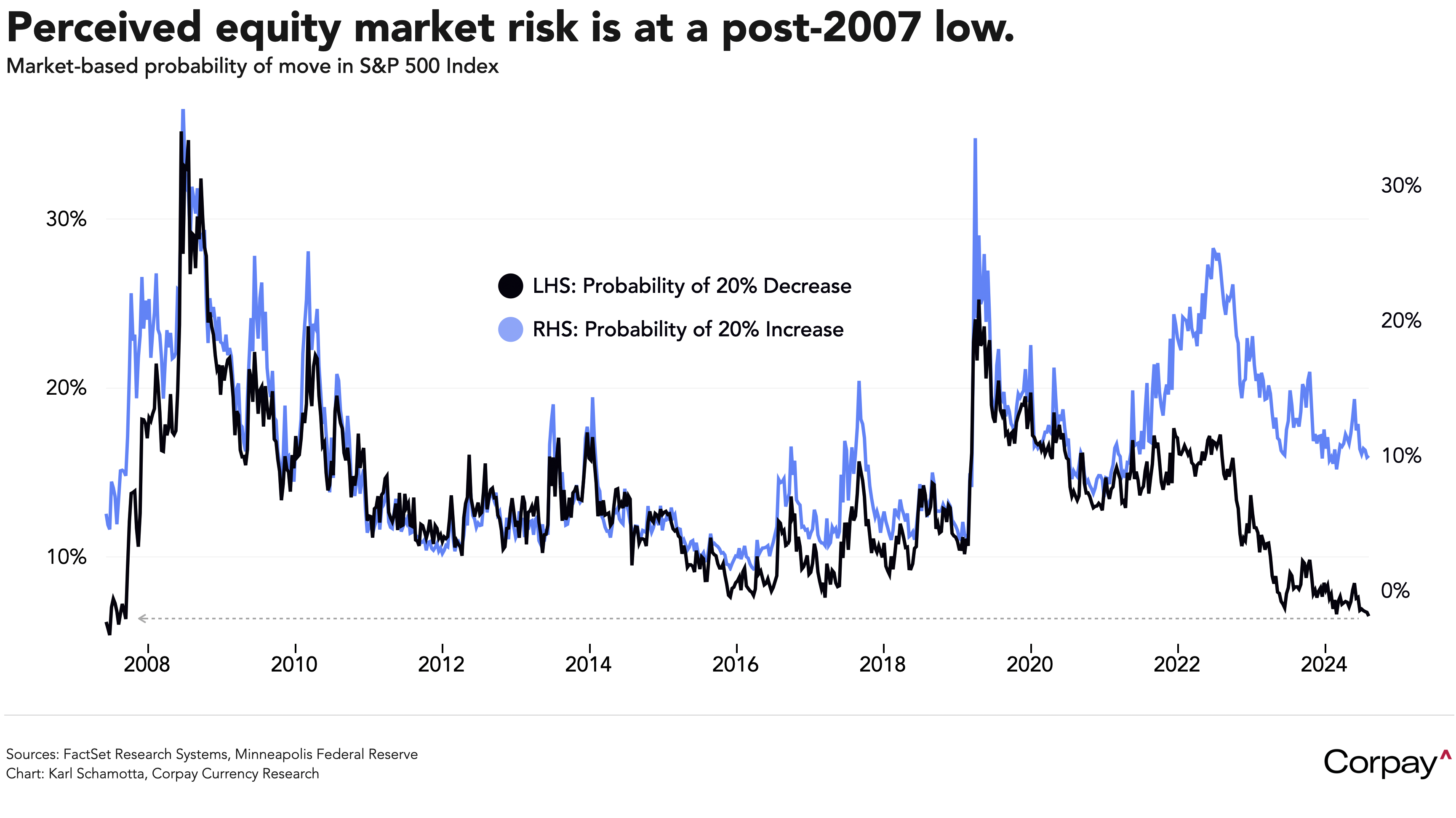 An old-fashioned selloff in equity markets could be the most significant macro risk on the horizon. Estimates of probabilities derived from options on the S&P 500 suggest that participants are assigning less than 6.5-percent odds to a 20-percent decline in the index over the next year, marking the lowest level recorded since June 2007. I probably sound like Chicken Little at this point, but this seems unsustainably low – particularly after the index added more than $16 trillion in value over the last two years – and important for currency markets, given the high correlations that have emerged between global exchange rates and US stock prices.