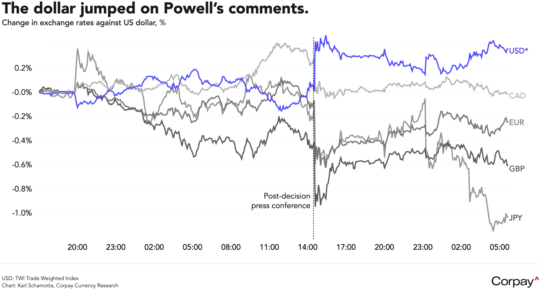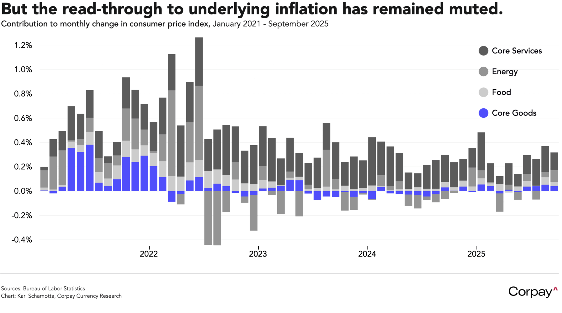The dollar spiked higher during yesterday’s Federal Reserve press conference when Jerome Powell warned markets not to expect another cut in December. Referencing the extent to which officials are struggling to forge a path between the two halves of the central bank’s price stability and employment mandate, Powell said “In the committee’s discussions at this meeting, there were strongly differing views about how to proceed in December,” noting that incoming data is still pointing to “nothing more” than a gradual cooling in labour markets, and that inflation remains contained outside tariff-affected goods categories. High-frequency data is pointing to outsized price pressures in imported goods categories: