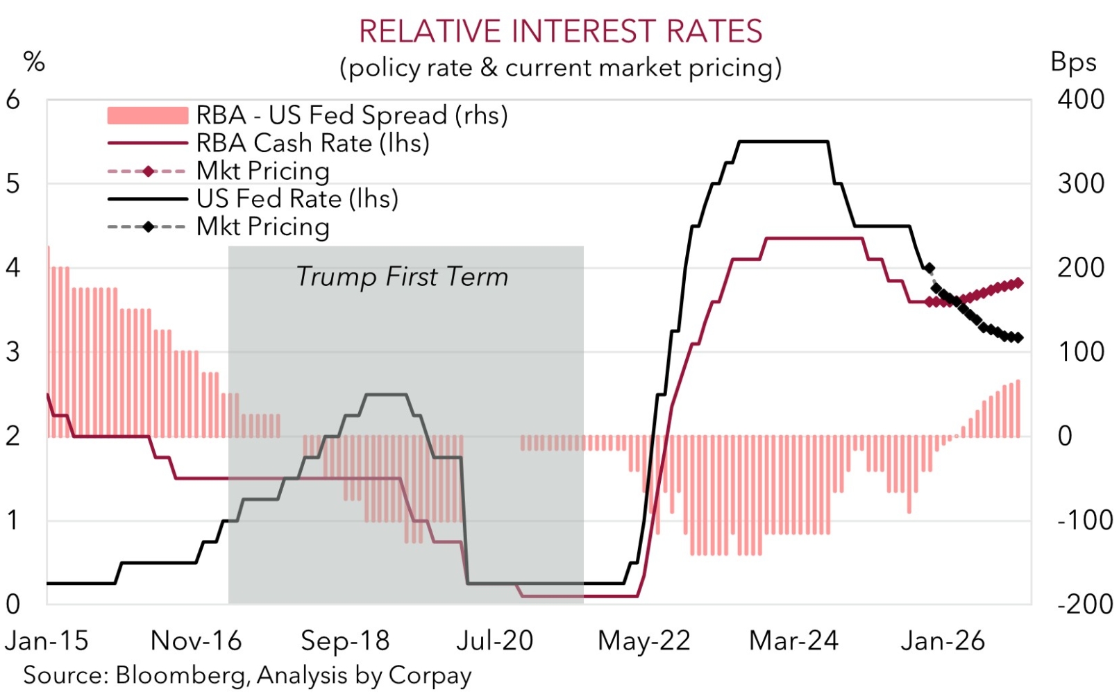 The weaker USD stemming from the disappointing US jobs data released overnight and outlook for US interest rate cuts has helped the NZD and AUD add to recent gains (see above). At ~$0.5774 the NZD is ~3.5% above the low touched around the RBNZ’s recent meeting where it cut interest rates but gave signals the move could be the last this cycle. The AUD (now ~$0.6601) is near the top of its 2-month range with strength on a few of the major cross-rates also supportive. AUD/EUR (+0.2%) nudged up further, as did AUD/CAD (+0.4%) and AUD/CNH (+0.4%). AUD/JPY (+0.1%) has also ticked up a bit more to levels last traded in mid-2024. As outlined previously, we believe AUD/JPY is looking stretched compared to drivers such as yield differentials with the cross-rate also tracking in somewhat rarefied air (since 1995 AUD/JPY has only been above where it is in ~2% of trading days).