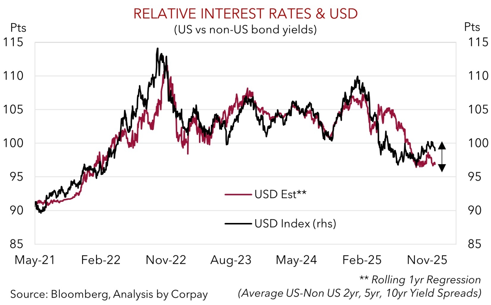 The overnight ADP employment figures have added significance as they are the most up-to-date jobs data US Fed officials will have on hand at their upcoming meeting (11 Dec AEDT). Odds of another interest rate reduction being announced by the US Fed are now tracking north of ~90% with over 3 cuts factored in by next October. Monthly Challenger job cuts data (11:30pm AEDT) and weekly initial jobless claims (12:30am AEST) are due tonight. These data points will provide a bit more colour about US labour market conditions. On net, we remain of the view that the step down in US growth, weakening jobs market, and outlook for lower US interest rates may continue to exert downward pressure on the USD. As our chart shows, the USD looks to be tracking too high compared to where relative yield spreads suggest it should be.
