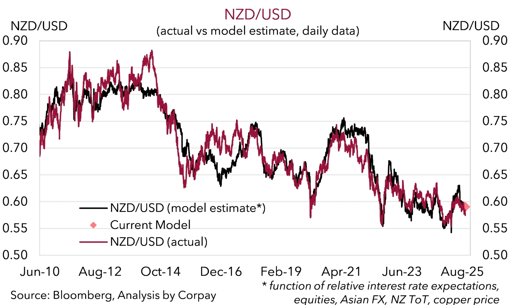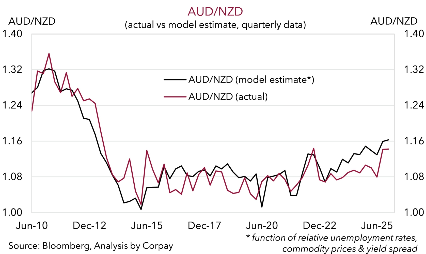 Moreover, we think the NZD can continue to struggle on the cross-rates, particularly versus the AUD. AUD/NZD has risen to levels last traded in Q4 2022 (now ~1.1425, NZD/AUD has fallen to ~0.8753) with relative economic and interest rate trends firmly in Australia’s favour, in our opinion. Our modelling suggests AUD/NZD has more upside potential (NZD/AUD more downside) with our estimated ‘fair value’ sitting closer to ~1.16 (or ~0.8621 for NZD/AUD) (chart 6). Note it has been almost 12-years since AUD/NZD traded north of 1.15 (NZD/AUD sub ~0.87).