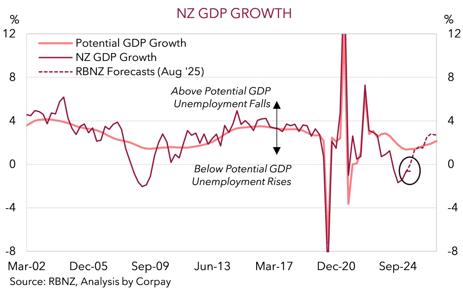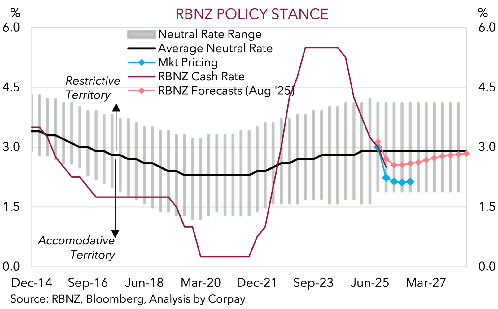 Ahead of the decision traders and economists were evenly split as to whether the RBNZ would deliver a standard 25bp interest rate reduction or a more aggressive step. In the end, the weakness in NZ’s economy, which has contracted in three of the past five quarters, and excess slack that has built up were issues too big for policymakers to ignore (chart 2). Today’s move puts the level of interest rates in NZ into “accommodative” territory, and there is scope for additional policy easing with the RBNZ noting the “committee remains open to further reductions” to help inflation settle around target over the medium-term (chart 3).