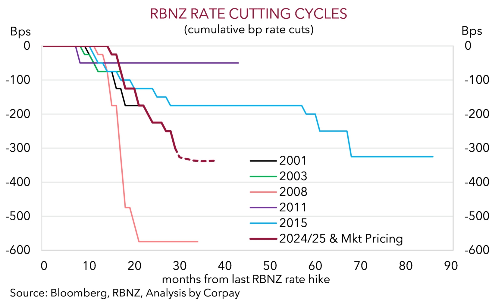 The “Go Big or Go Home” mentality was on display once again in NZ today after the RBNZ delivered an outsized 50bp interest rate cut as it attempts to jolt the stuttering economy back to life. The decision lowers the RBNZ’s official cash rate to 2.5%. This is ~300bps below the peak reached in 2023/24 when the world was fighting the post COVID inflation surge. As our chart shows, outside of the Global Financial Crisis, this is one of the most abrupt policy U-turns in several decades (chart 1). And in our opinion, the RBNZ may not be done yet.