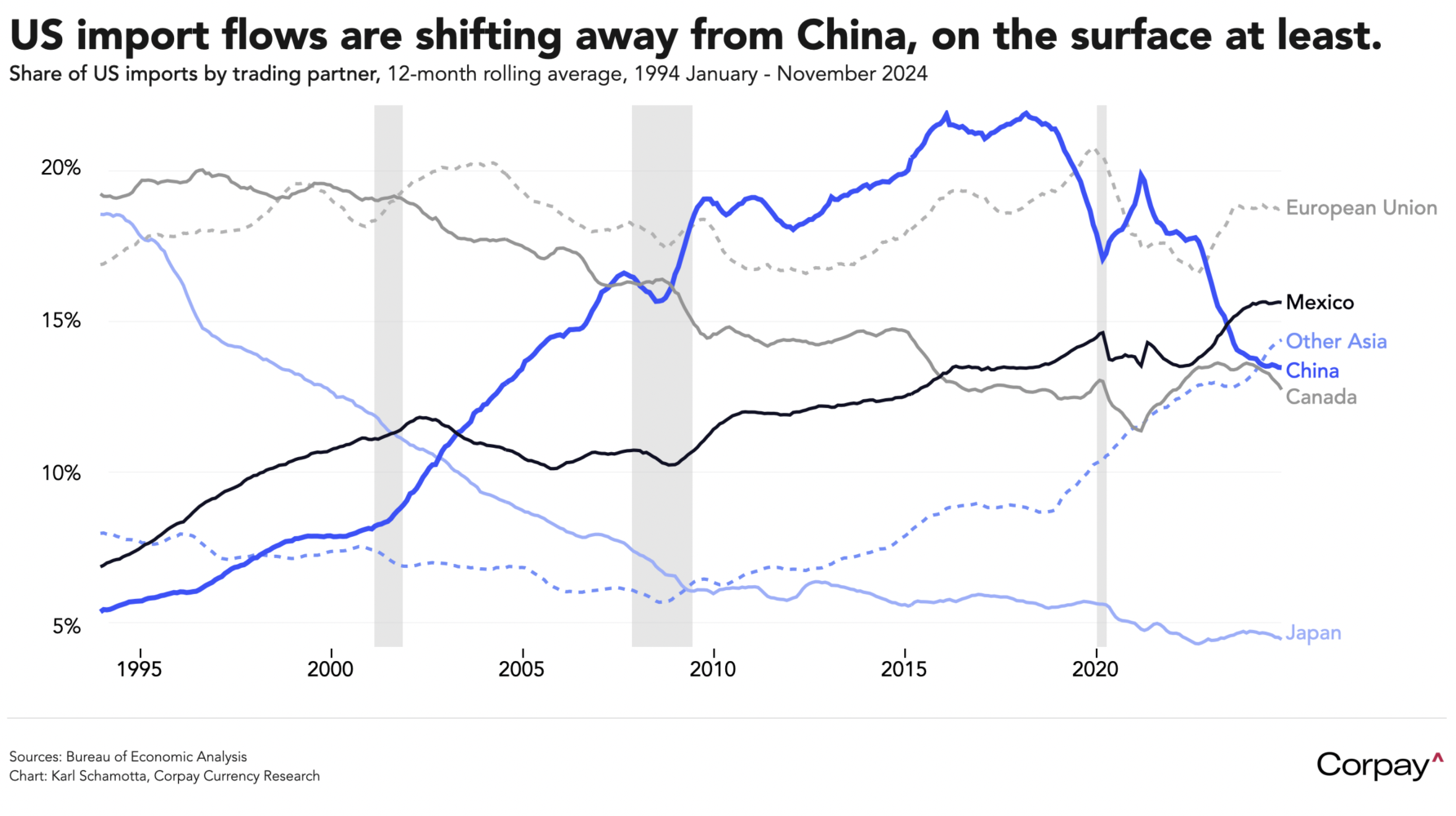 *As we’ve argued previously, it is clear that supply chains are lengthening, with the origin of many products remaining in China and final processing happening in intermediary countries. This makes it likely that the Trump administration will attempt to extend protectionist policies further upstream in the months ahead.