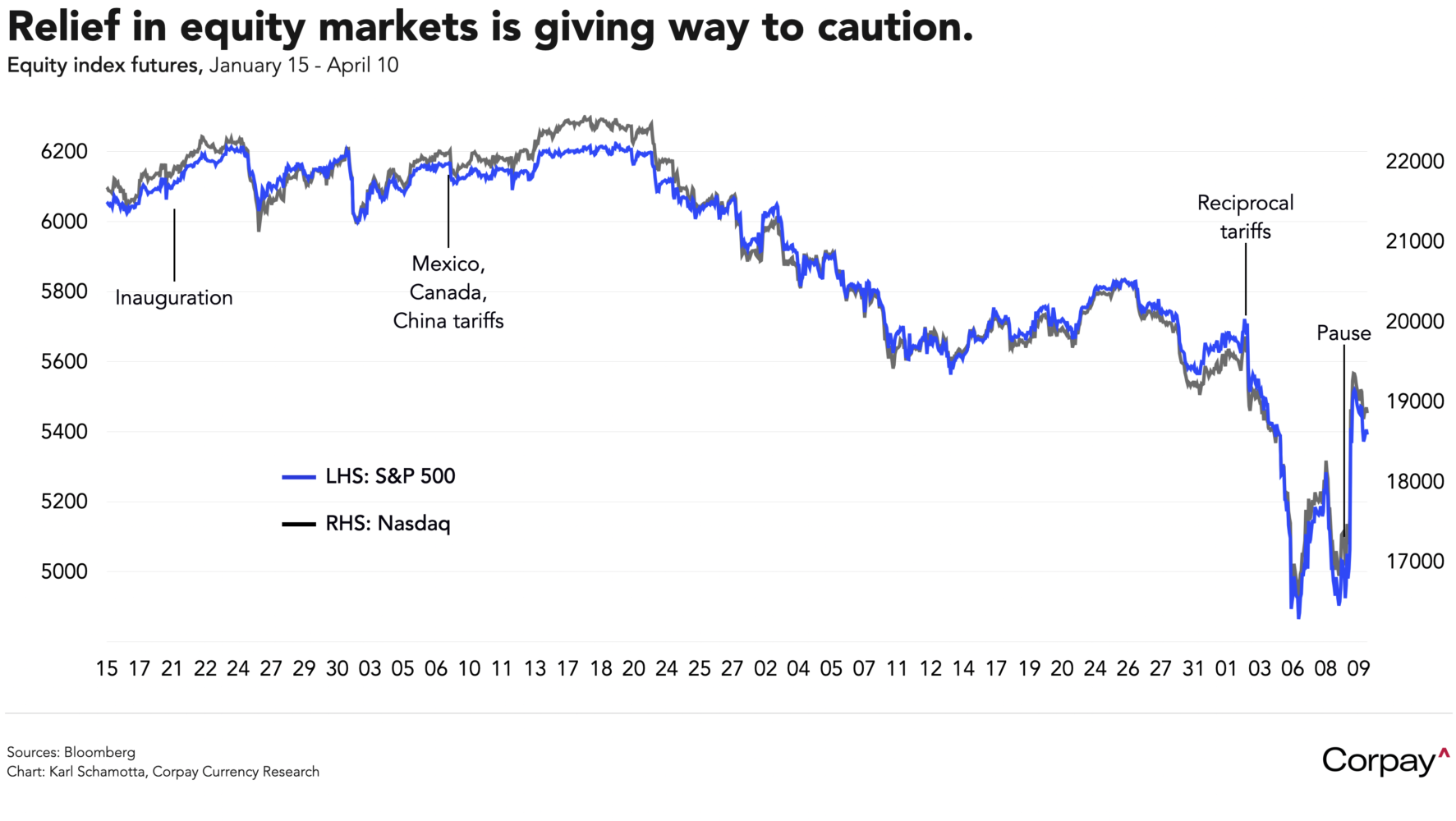 Stock-index futures are edging lower and the dollar is weakening once more as the initial optimism sparked by yesterday’s tariff reversal yields to a more measured assessment of the risks still facing the US and world economies. Equity futures are setting up for a circa-1.5-percent loss at the North American open, ten-year Treasury yields are stuck near the 4.3 percent mark, and the greenback is heading toward a third day of losses against its major counterparts. The safe-haven Japanese yen is in the ascendant, and the euro is climbing after European Union officials announced plans to postpone retaliatory measures against the United States, and the Canadian dollar is trading sideways while the Mexican peso and Swiss franc underperform their peers.