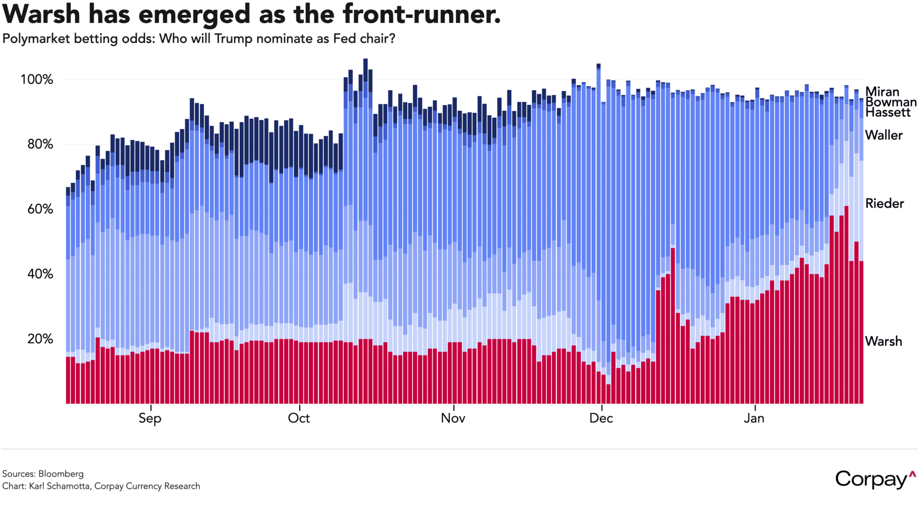 Fears of an erosion in the Fed’s independence are retreating along other vectors. Betting markets now point to Kevin Warsh as the leading contender to succeed Jerome Powell when his term ends in May, after President Trump appeared to play down Kevin Hassett’s chances in an interview last week. Warsh, who served as a Fed governor from 2006 to 2011, was often on the wrong side of inflation calls—including urging tighter policy as Lehman Brothers collapsed—but has since built a profile as a critic of the central bank’s governance, is politically well-connected, and looks the part—an important variable in the president’s estimation. Traders perceive him as someone likely to deliver modestly lower rates, but also as someone with the sound-money credentials needed to keep inflation expectations anchored over time.