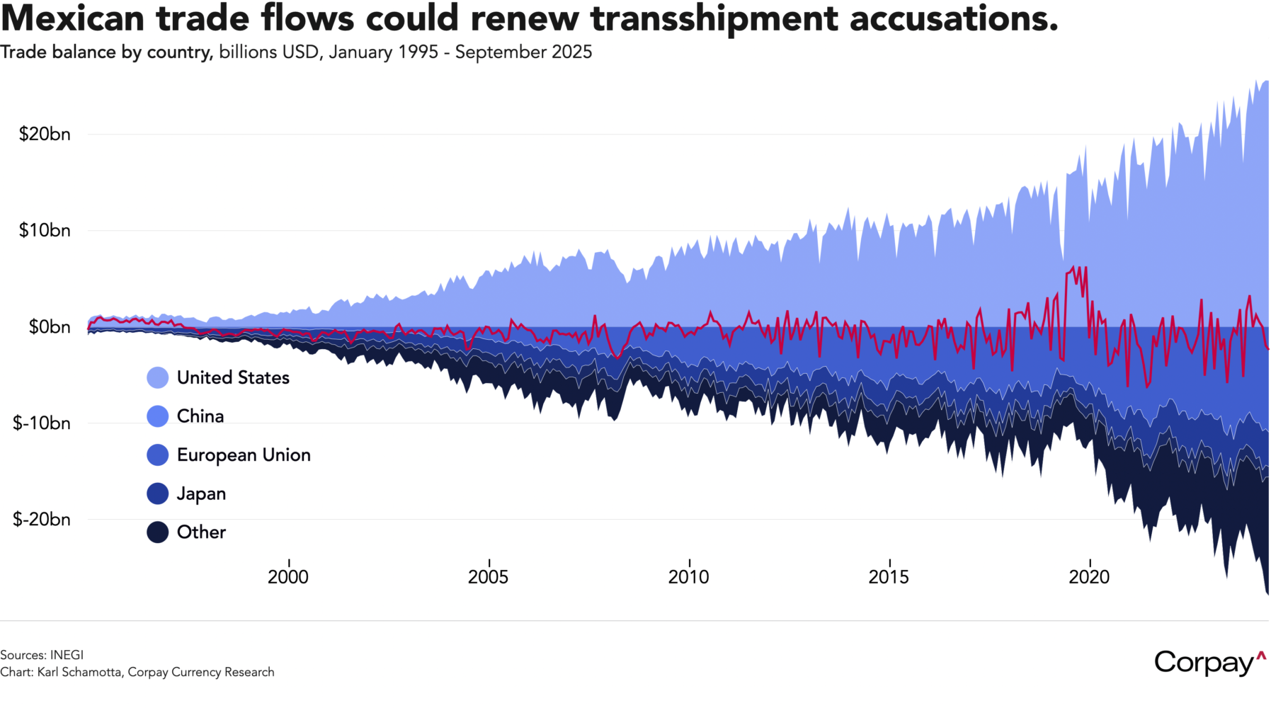 The currency has outperformed our expectations for the better part of two years, but we’re not sure how long its current strength can last. Although Mexico’s exports to the US have soared, imports from other countries have grown at a similar pace, suggesting that the economy is functioning less as a new manufacturing hub than as a logistical conduit through which products are routed into the United States. This pattern is consistent with firms exploiting trade agreements, geographical proximity, and final assembly capacity to sidestep the Trump administration’s tariff regime, leaving America’s dependence on imports effectively unchanged—and it raises the possibility that US officials take a harder line when it comes to the upcoming renegotiation of the US-Mexico-Canada trade agreement. Event risks seem underpriced, and the peso’s current valuations look stretched.
