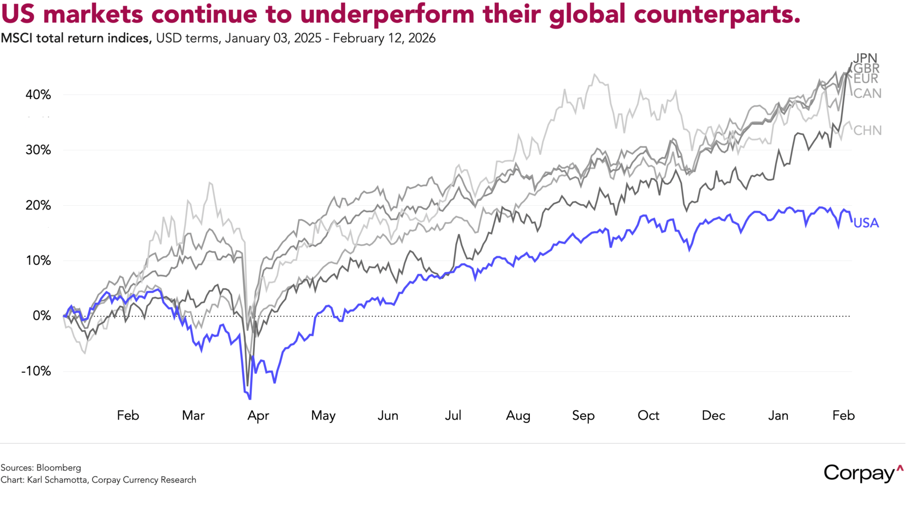 Equity markets have retreated from record highs as investors grow more sceptical about the durability of earnings growth among the largest artificial intelligence-linked firms and worry about the disruption spreading across the broader technology sector. A renewed rise in policy uncertainty—around trade, fiscal sustainability and regulation—has also lifted the discount rate applied to future profits, undermining the most crowded growth trades. US equities in particular are underperforming global peers largely because American leadership remains concentrated in richly valued megacap tech and is exposed to higher levels of political instability, while other regions benefit from cheaper valuations, clearer policy settings and diversification-driven flows.
