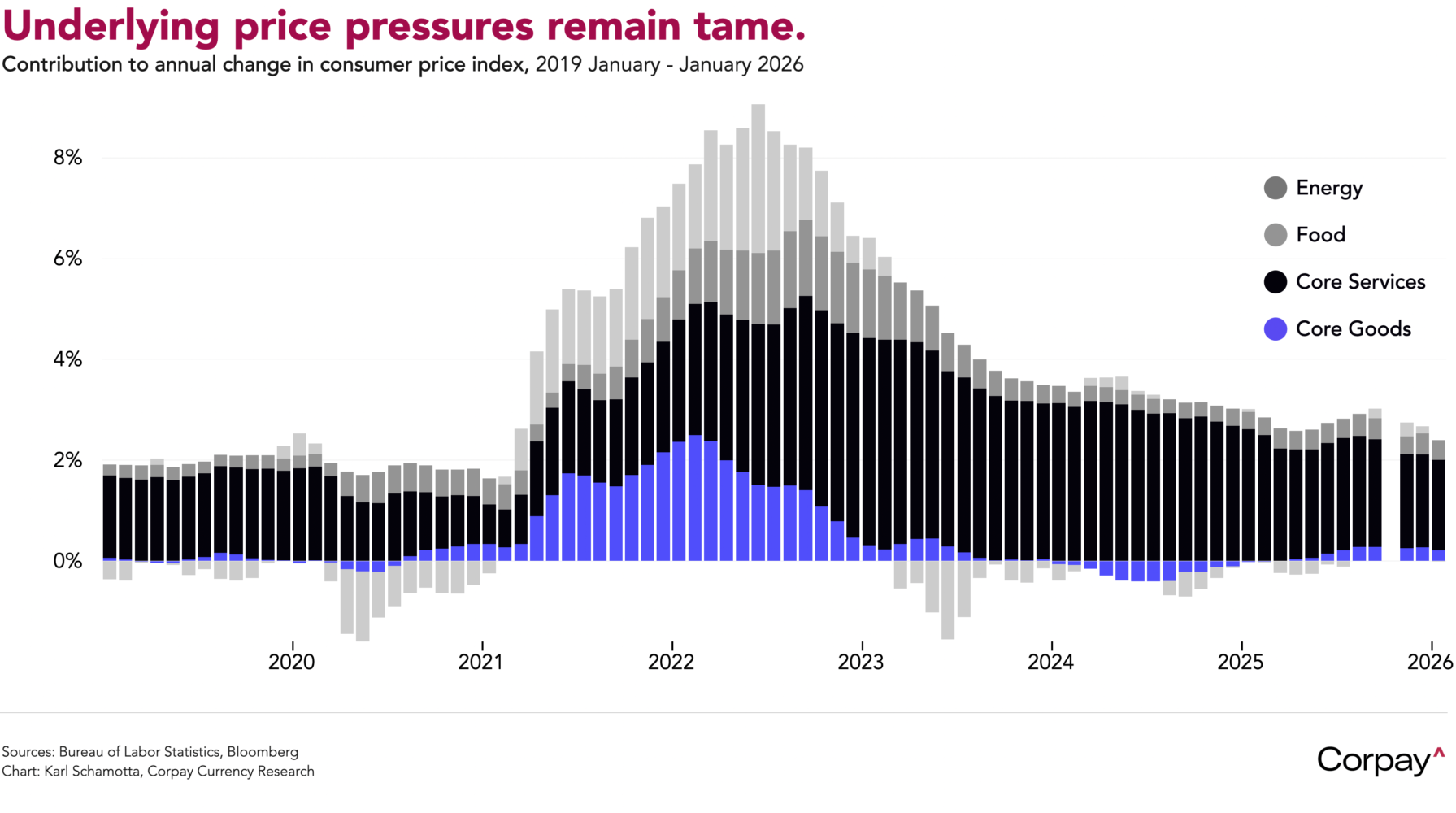 Evidence of tariff-induced price pressures remained unclear, with core goods costs remaining restrained. Core goods prices excluding autos have risen just 1.6 percent over the last year—the fastest since 2023, but well below levels that had been feared—reflecting margin absorption among importing firms, inventory front-loading, supply chain rerouting, disinflation in major exporting countries, and the fact that the US remains a closed economy with low import penetration. Research published by the New York Fed yesterday found that prices of tariffed goods rose about 11 percent more than other goods in 2025, but with most consumer spending directed toward domestically-produced services, the aggregate impact on measured inflation has been relatively muted.