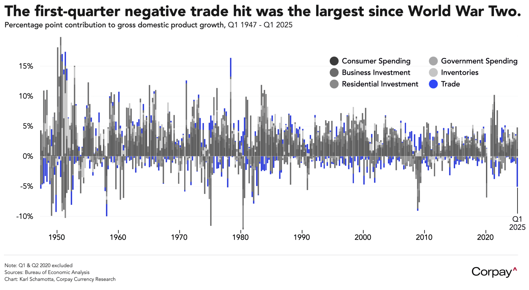 Data published yesterday overstated the scale of the downturn in the US economy. A massive jump in the trade deficit in the first quarter – driven by a 41.3-percent annualised surge in imports ahead of the Trump administration’s threatened tariffs – subtracted 4.8 percentage points from the growth rate, which is meant to measure the value of domestic production. In data that goes back to 1947, the economy has never seen a larger negative hit from net exports in one quarter.