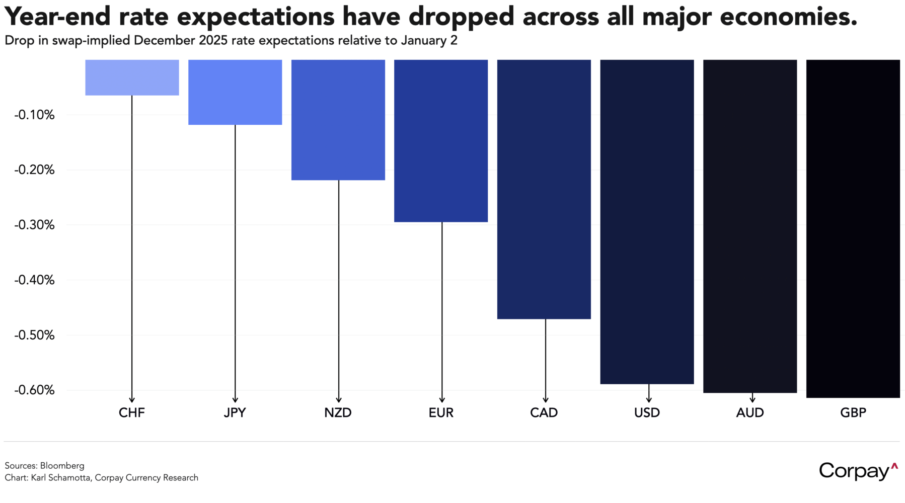 Japanese government bond yields are down and the yen is weaker after the Bank of Japan left rates unchanged, downgraded its growth outlook, and extended the expected timeline for achieving its 2-percent inflation target. In a widely-expected unanimous decision, the central bank maintained its benchmark policy rate at 0.5 percent, but also cut its economic growth forecast for the fiscal year ending March 2026 to 0.5 percent from 1.1 percent, and said it expects core inflation to reach target a year later than previously estimated. During the post-decision press conference, Governor Ueda said “Recent developments surrounding tariffs will weigh on Japan’s economy by slowing global growth, hurting corporate profits, and prodding households and companies to hold off on spending due to heightening uncertainties,” although ultimately, “we expect a positive cycle of rising wages and inflation to continue due to a severe labour shortage”. “It’s hard to judge now when we will see the likelihood of our scenario being achieved,” he said. “As such, we would like to take a flexible approach in our policy response”. Markets are now placing just 20-percent odds on a rate hike by year end, aligning the Bank of Japan with the downgrade in expectations that has occurred across most major economies since the start of the year.