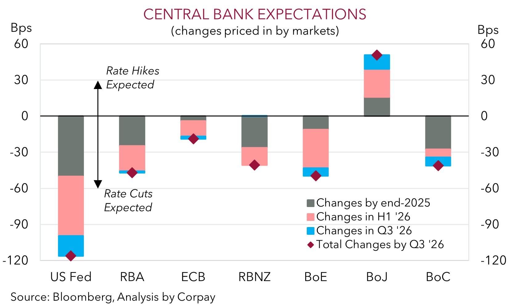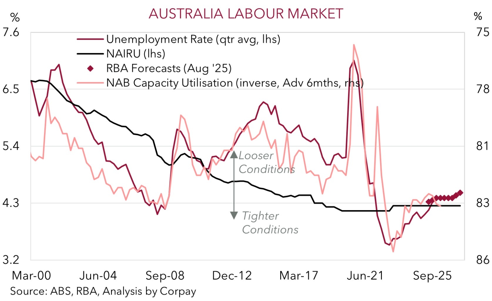 Locally, last weeks Australian jobs report, which showed softer employment growth in September and a rise in unemployment to 4.5%, grabbed a few headlines. The data also saw markets adjust expectations for another RBA interest rate cut over the next few meetings with a move in early November now assigned a ~70% probability. We think trigger happy markets might be factoring in too high a chance of the RBA moving in November given the prospect of Q3 CPI inflation (due 29 October) coming in north of the RBA’s forecasts. Indeed, even when it comes to the labour market, the monthly data is notoriously volatile, and while conditions are cooling broader measures still don’t show a significant loosening with the average of the unemployment rate over Q3 broadly inline with the RBA’s ~4.3% projection (see chart below). We believe a confirmation in the upcoming quarterly CPI that the inflation pulse remains firm could temper the markets enthusiasm about near-term RBA rate cuts, which if realised may give the AUD support.