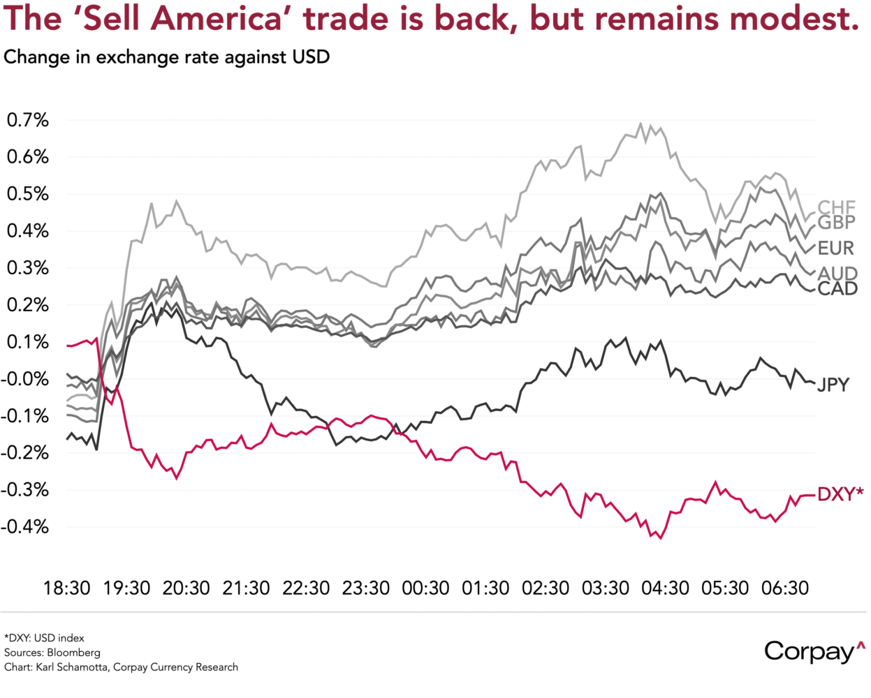 The US dollar, Treasuries, and stock market indices are all trading slightly lower this morning after the Trump administration stepped up its assault on the Federal Reserve, launching a criminal investigation into Chair Jerome Powell’s management of a headquarters renovation project. According to a highly unusual video statement published last night, the Chair said he had received grand jury subpoenas from the Justice Department that threaten a criminal indictment in a case that most market participants see as part of an effort to reduce the Fed’s independence and push monetary policy into more accommodative territory. “This is about whether the Fed will be able to continue to set interest rates based on evidence and economic conditions,” said Powell, “or whether instead monetary policy will be directed by political pressure or intimidation”.
