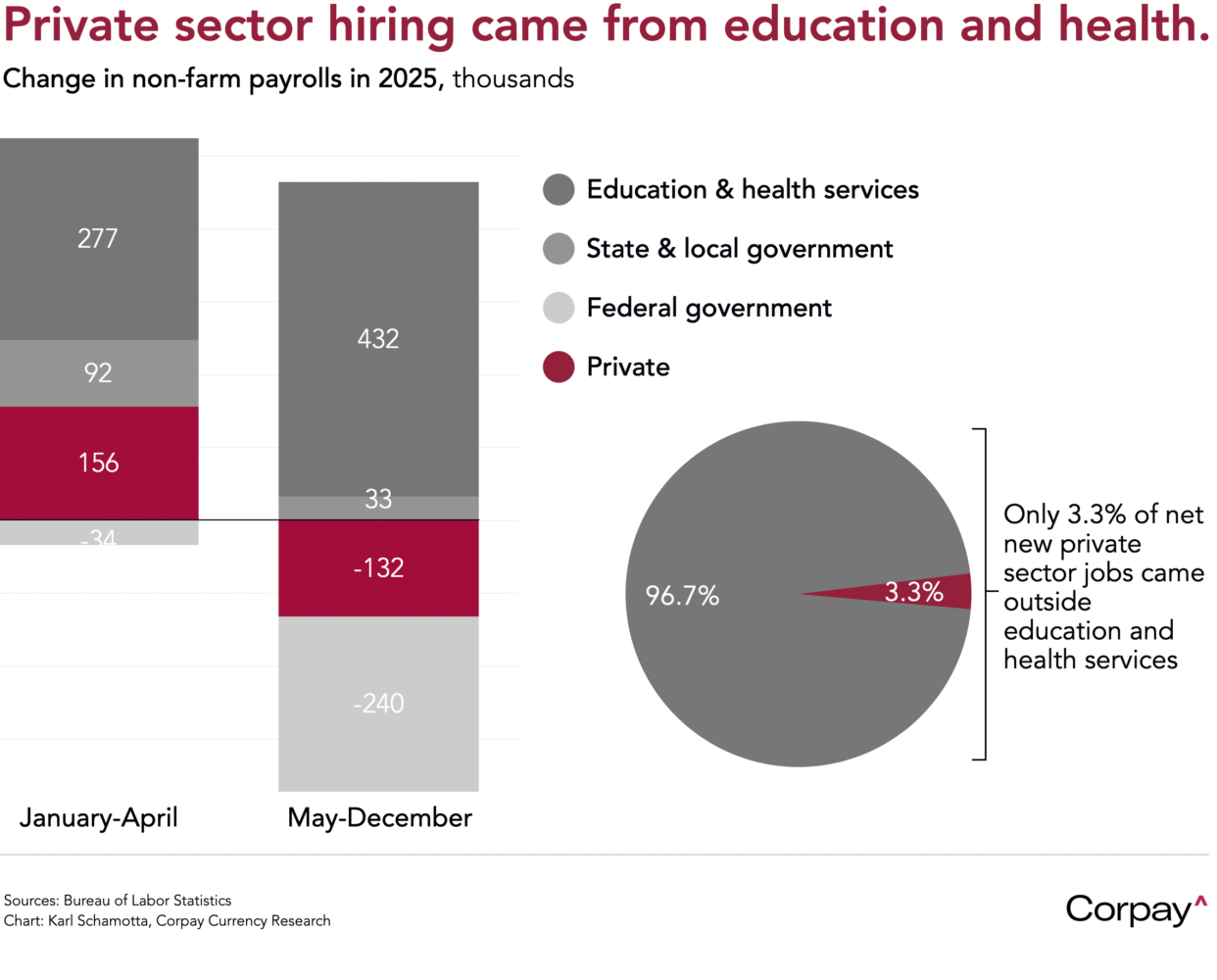 The details were less promising, however. Overall payrolls grew by an average of 49,000 a month in 2025, down from 168,000 the year before, and business hiring turned net negative after Liberation Day in April, with 96.7 percent of all private sector jobs added in the education and healthcare sectors alone. Companies aren’t laying off workers in significant numbers, yet appear reluctant to increase payrolls against a deeply uncertain backdrop, with operating costs climbing, tariff policies in flux, and artificial intelligence advancements potentially substituting for new employees.