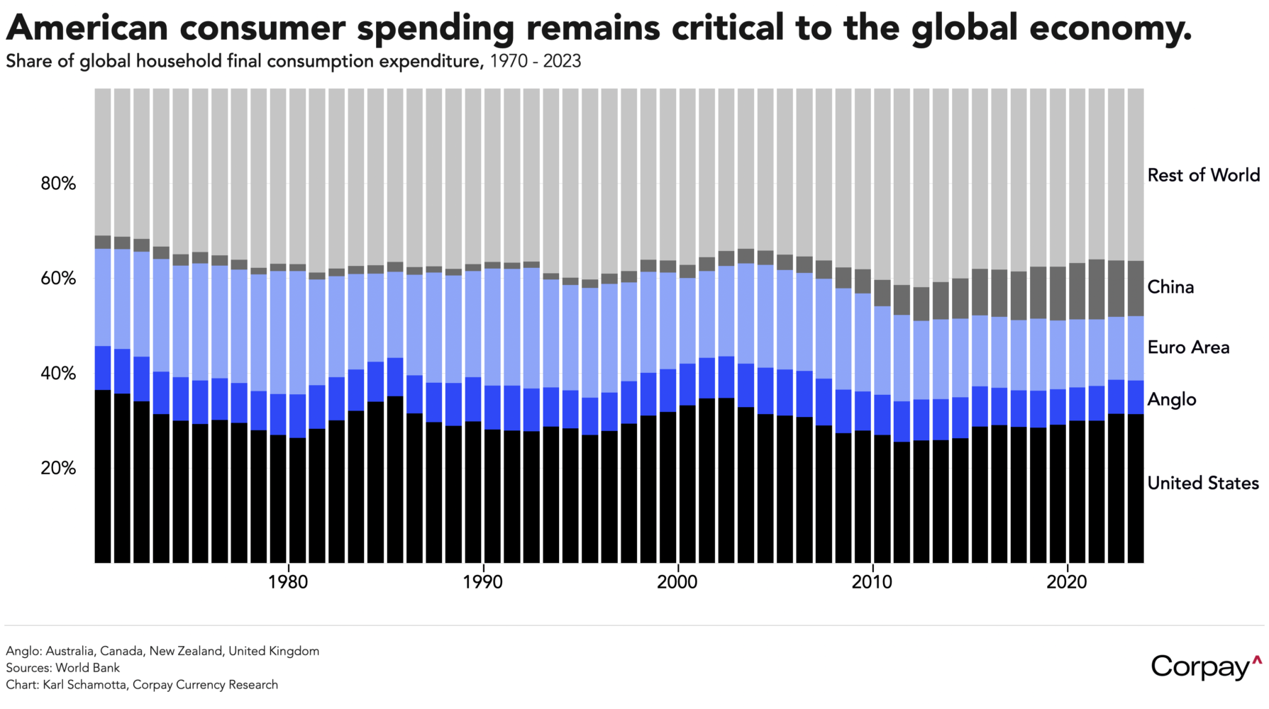 But the “sell America” trade in foreign exchange markets is looking dangerously overextended. We highly doubt the dollar has permanently lost its safe haven appeal, given that the US retains the world’s deepest financial markets, biggest economy, and most powerful military — and that deeply-embedded network effects underpin the greenback’s dominance in trade, payments, cross-border financial flows, and debt intermediation. The American consumer market remains, by far, the biggest in the world*, meaning that a slowdown will undoubtedly have tertiary spillover effects in other countries.