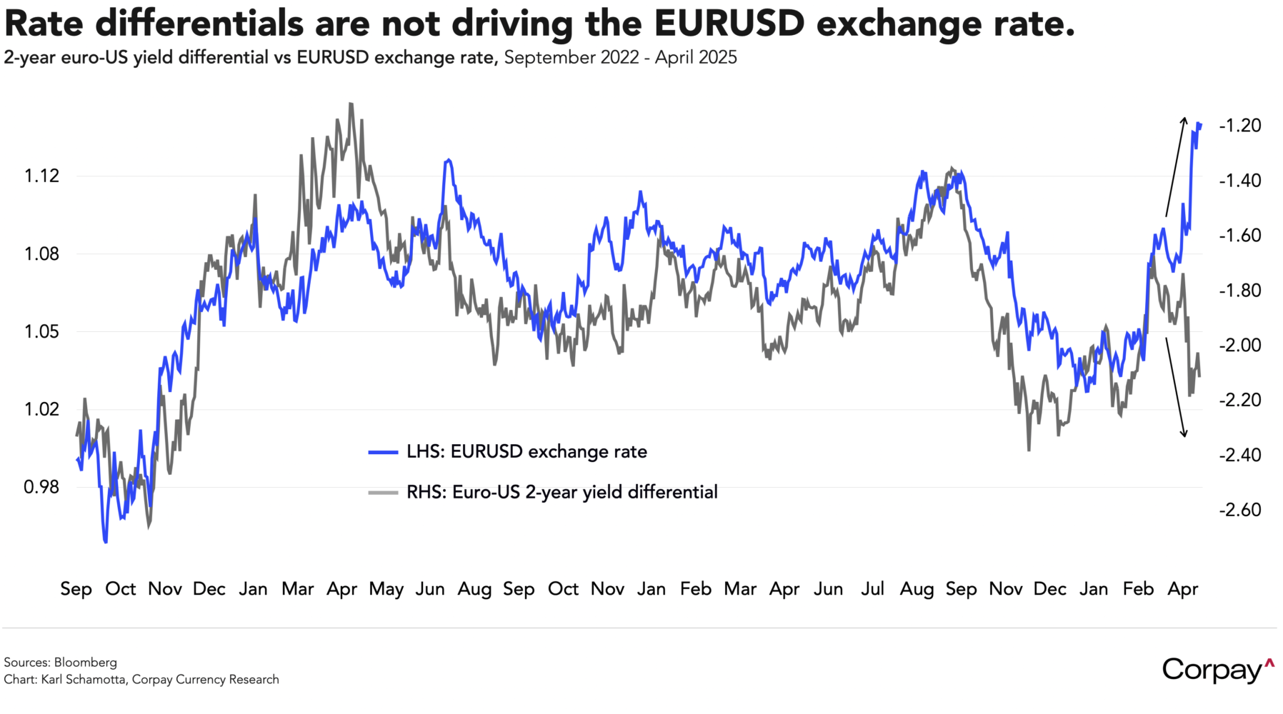 The drama is nonetheless undermining confidence in US-denominated assets. Policy uncertainty is holding at levels exceeding those hit during the pandemic in early 2020, with businesses, investors, and consumers remaining deeply unsure about the government’s direction on trade, spending, taxation, central bank independence, and foreign relations. Tomorrow’s raft of domestic purchasing manager indices – along with the Fed’s Beige Book economic survey – will almost certainly illustrate the damage being inflicted on the American manufacturing sector, with “bullwhip” effects likely to show up in reported order volumes, inventory growth, and input prices. Expected growth differentials have narrowed against the United States, and real money flows – directed by large institutions with long-term investment objectives – are flooding into other countries as investors reassess the risks associated with an overconcentration in a single, increasingly unstable market.