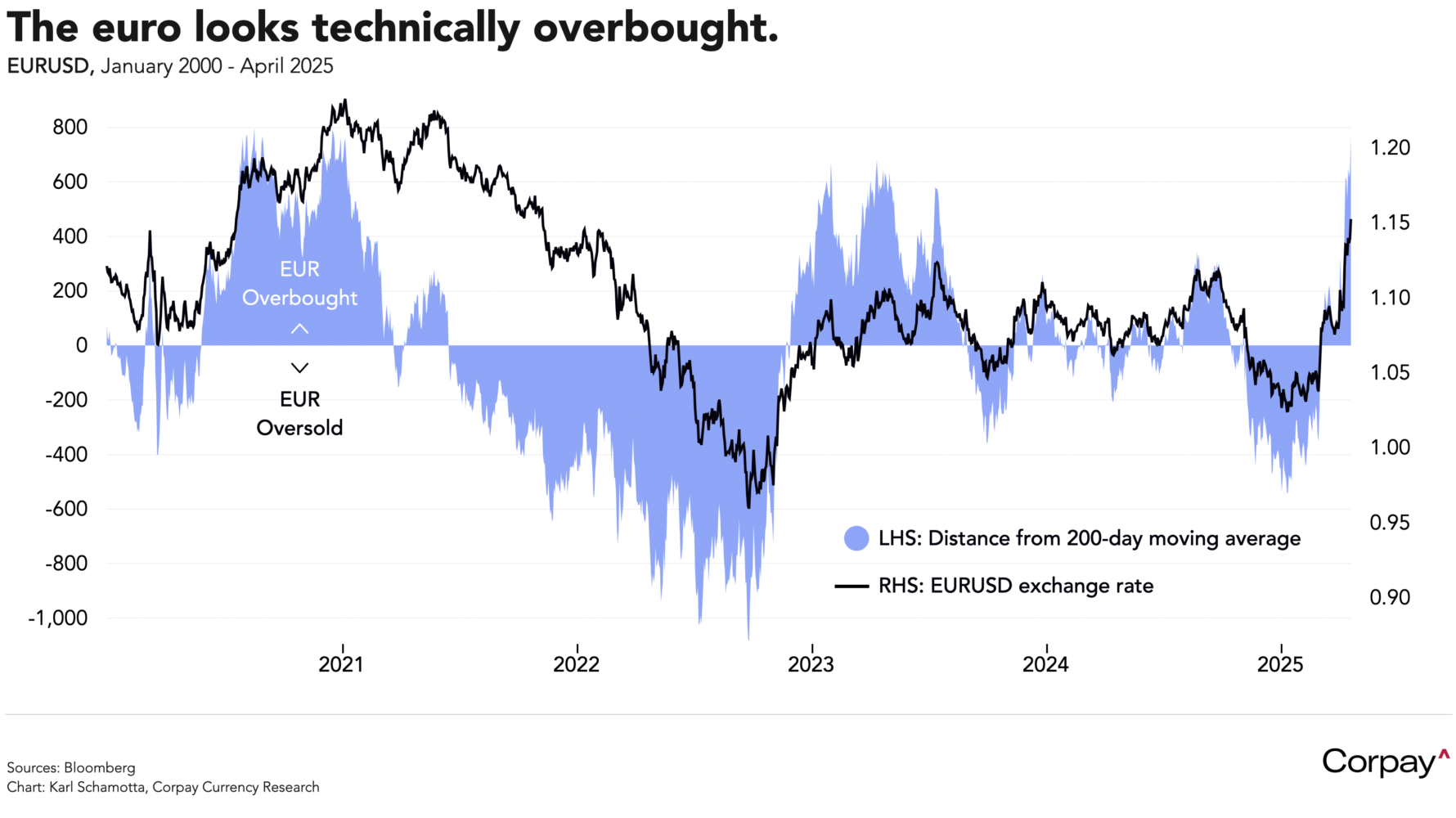 From a technical standpoint, the euro now looks overbought, with the exchange rate well above its 200-day moving average – something that has historically foreshadowed a correction – and we suspect that the currency will struggle to make sustained headway above the 1.15 threshold against the dollar. A push above 1.20 is possible in the event that the Trump administration succeeds in breaking the Fed, leading to Nixon-style outcomes in global financial markets, but this shouldn’t represent anyone’s base case.