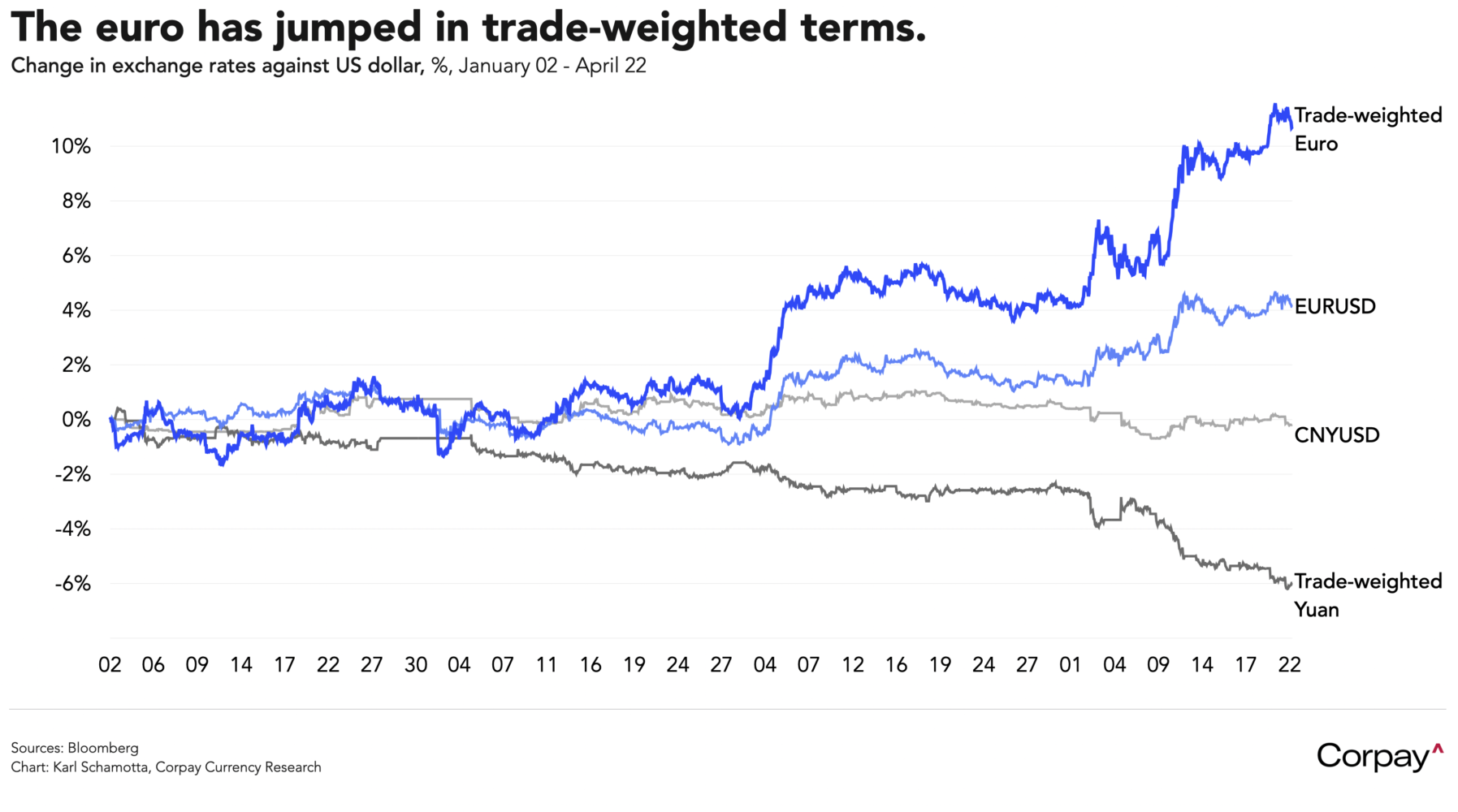 The euro looks particularly vulnerable to a US-driven retracement. The common currency has now climbed almost 13 percent from its February lows, but its gains have come almost entirely at the dollar’s expense: the exchange rate has broken its long-standing relationship with interest differentials, suggesting that domestic European fundamentals aren’t playing a major role in driving price action.
