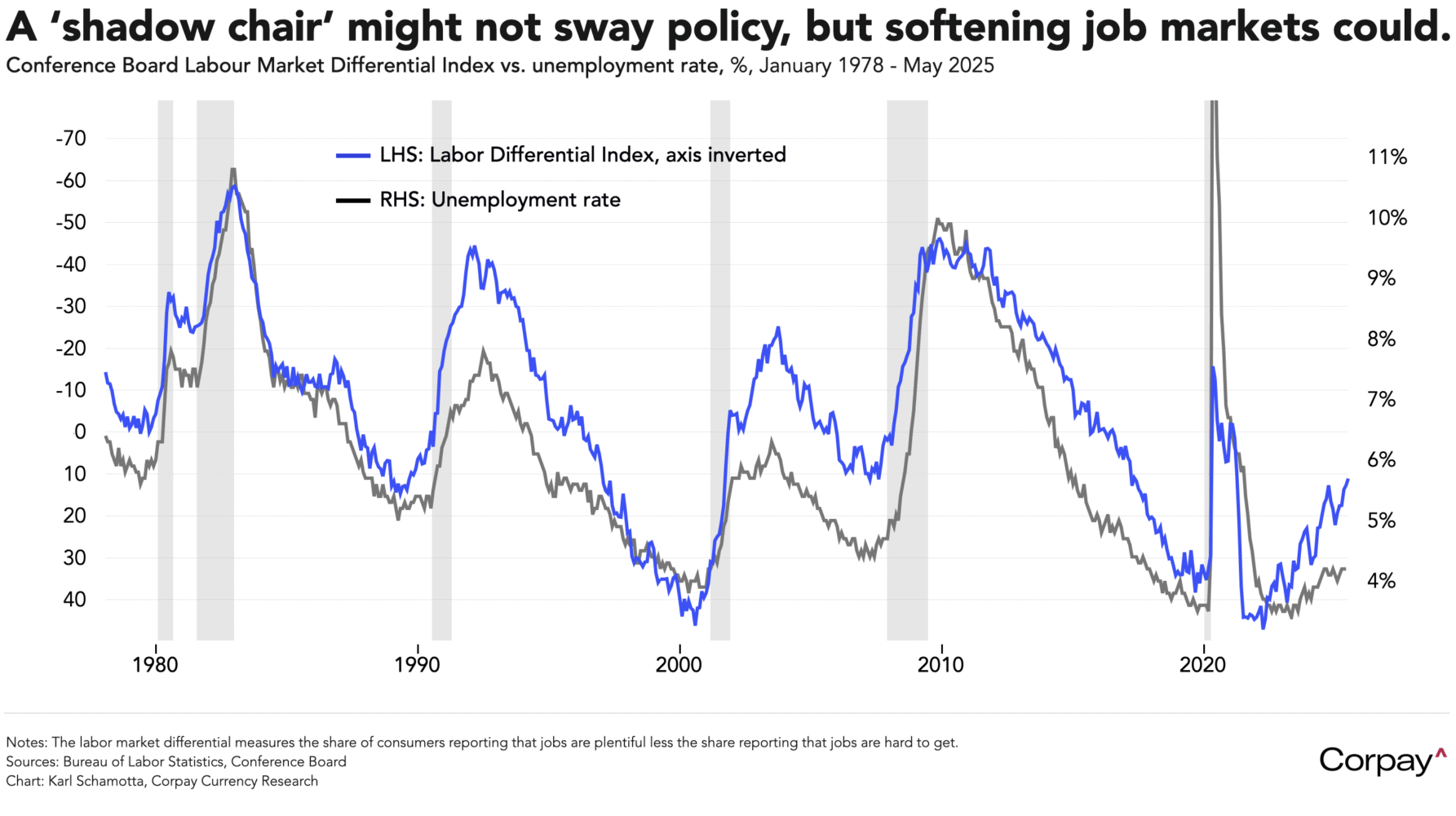 We’re not convinced that a Trump-aligned “shadow chair” would succeed in driving policy rates lower. The Fed is structured to avoid political interference: rates are set by twelve members who are appointed for terms that span presidential administrations, and there are no structural imperatives that demand policymakers fall behind the chair’s opinion when decisions are made. Meeting transcripts over recent decades have been overwhelmingly consistent with a consensus-driven—not top-down—process.
