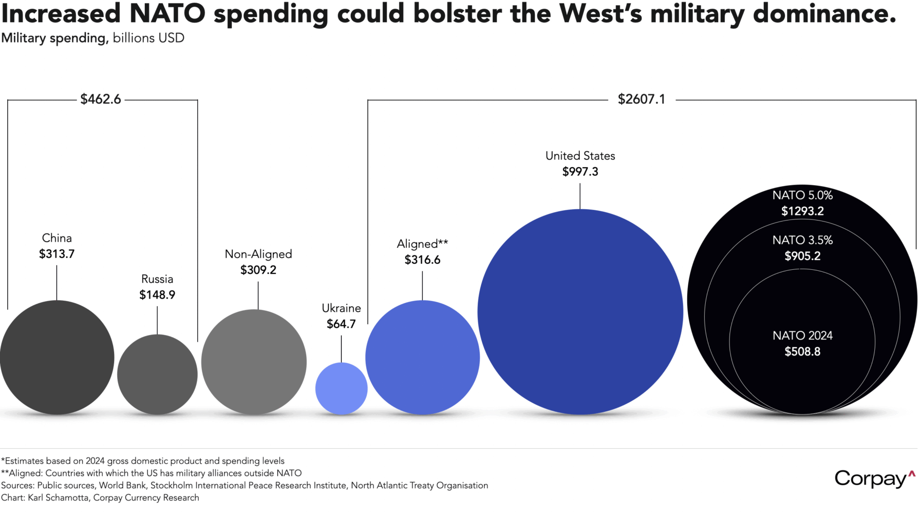 We don’t expect increased military spending to deliver immediate and material benefits to the European economy beyond the psychological effects, given the long time lags that typically accompany defence-related investment initiatives. Yesterday’s agreement among NATO allies requires countries to increase military spending to 5 percent of gross domestic product—3.5 percent on core defence and 1.5 percent on related infrastructure—could tilt the global balance of power more firmly toward the West, but doesn’t become binding until 2035, and isn’t set to be reviewed until 2029 (perhaps not uncoincidentally the same year in which President Trump’s second term expires). It just isn’t realistic to expect that nations already suffering from severe fiscal constraints will succeed in launching and implementing defence spending initiatives in the coming months on an economy-altering scale.