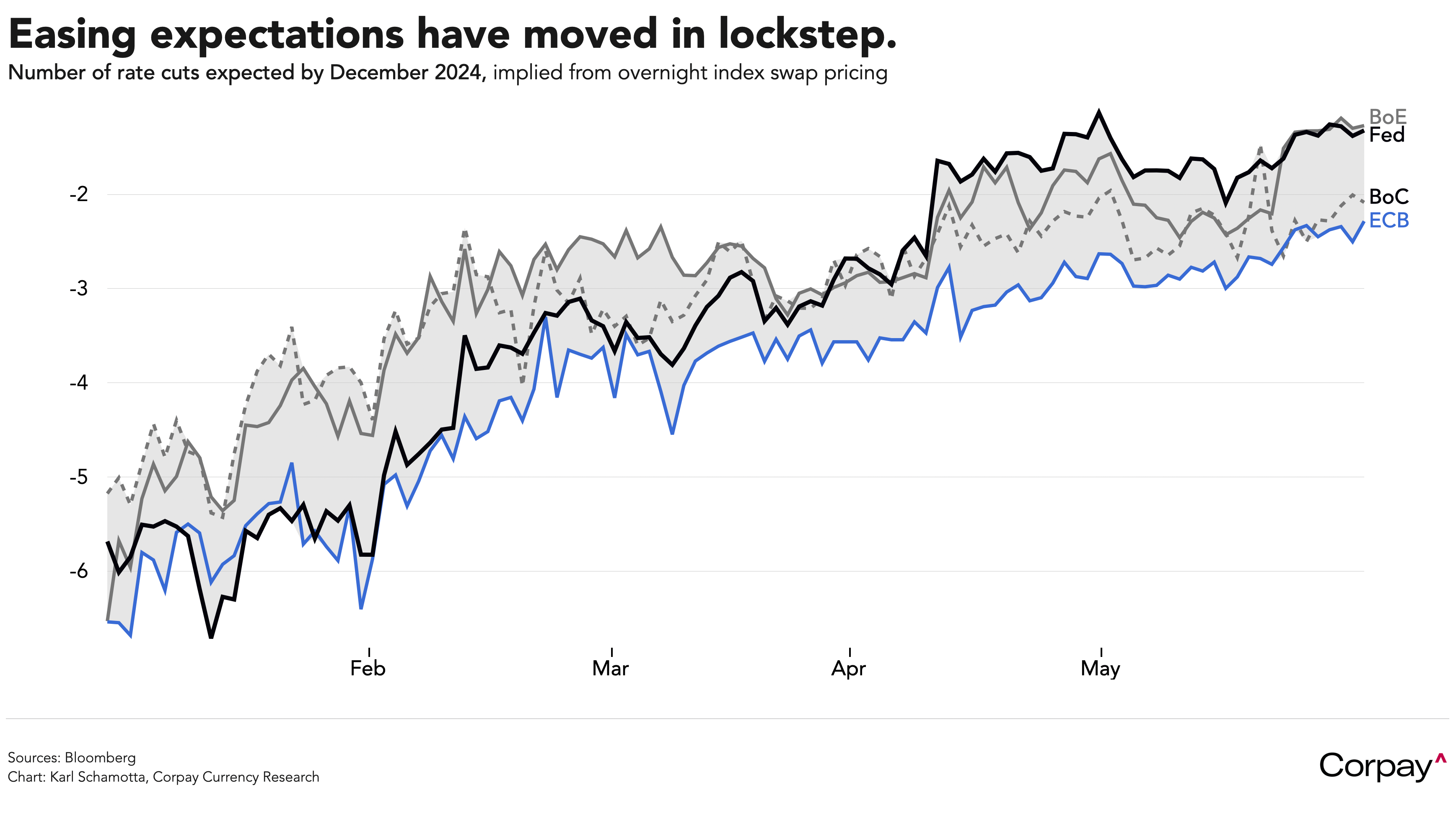 The euro is trading with a firmer bias as markets price in a slower pace of easing in 2024, but it is important to note that for all the talk of monetary “divergence” that has dominated sell-side research notes, the number of rate cuts expected from the major central banks by December has moved down in relative synchrony this year. Although the leaderboard has changed somewhat as the US economy has demonstrated surprising resilience, the dispersion between near-term policy expectations implied in overnight index swap prices is actually slightly narrower than it was in mid January. Our long-expected rise in currency volatility simply hasn’t come to pass.