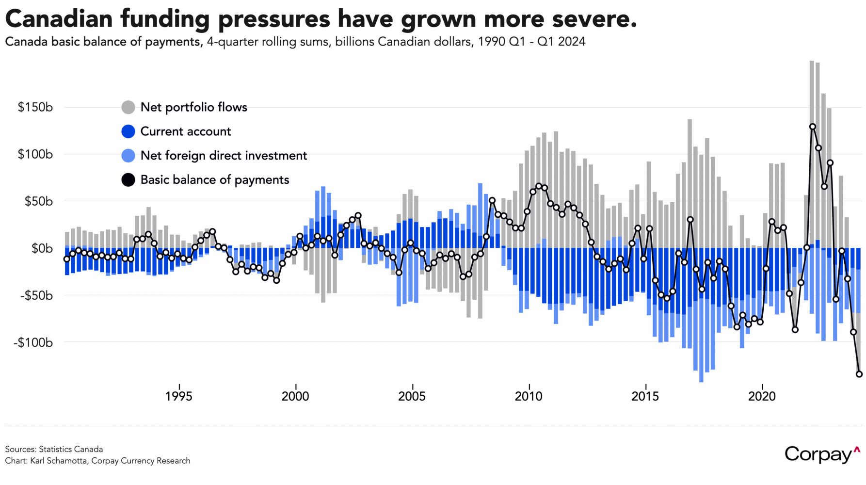 But one of the fundamental drivers behind the Canadian dollar’s recent underperformance became a little more clear with yesterday’s release of first-quarter balance of payments data. In nominal 4-quarter rolling sum terms, Canada’s net basic balance – the broadest measure of capital flows in and out of the country – fell to a historic low in the first three months of 2024 as domestic investors and businesses moved money out of the country, and as foreign investors lost interest in Canadian assets. The current account spent a seventh consecutive quarter in negative territory, net portfolio flows were deeply negative for a second quarter as Canadian investment abroad outpaced foreign investment in Canada, and the sale of HSBC’s operations to RBC widened an already-gaping net foreign direct investment deficit.