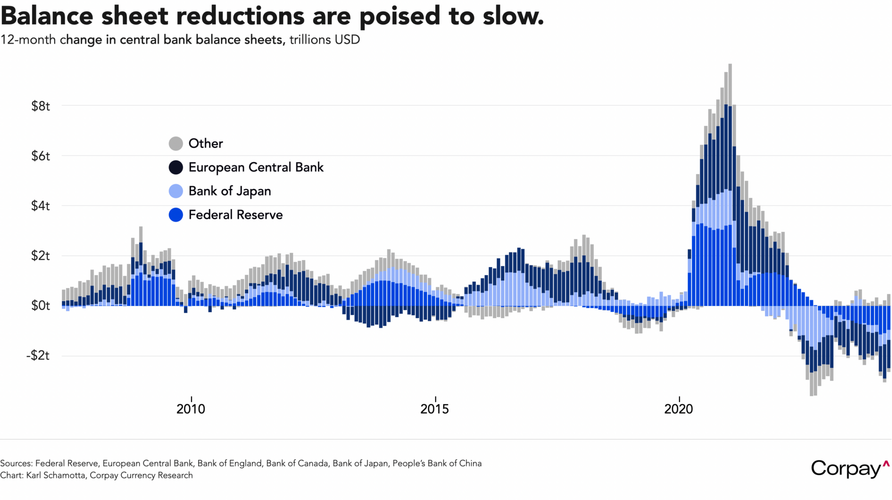 And an adjustment in balance sheet policy might trigger a Pavlovian response from markets. Like its major counterparts, the Fed has been winding down its assets at a fairly aggressive pace over the last year, but officials are becoming concerned that pace of “runoff” – currently set at around $60 billion per month – could ultimately lead to disruption in funding markets. Beginning with a speech from Dallas’ Lorie Logan in January and culminating in Chair Powell recently saying “it will be appropriate to slow the pace of runoff fairly soon,” policymakers have prepared markets for an imminent decision. A lower runoff cap might theoretically subtract from the tightening impulse in liquidity conditions, leading investors to take more risk, but there’s not a lot of evidence that global balance sheet reductions have negatively impacted markets – under most calculation methodologies, financial conditions are now easier than before the Fed began raising interest rates.
