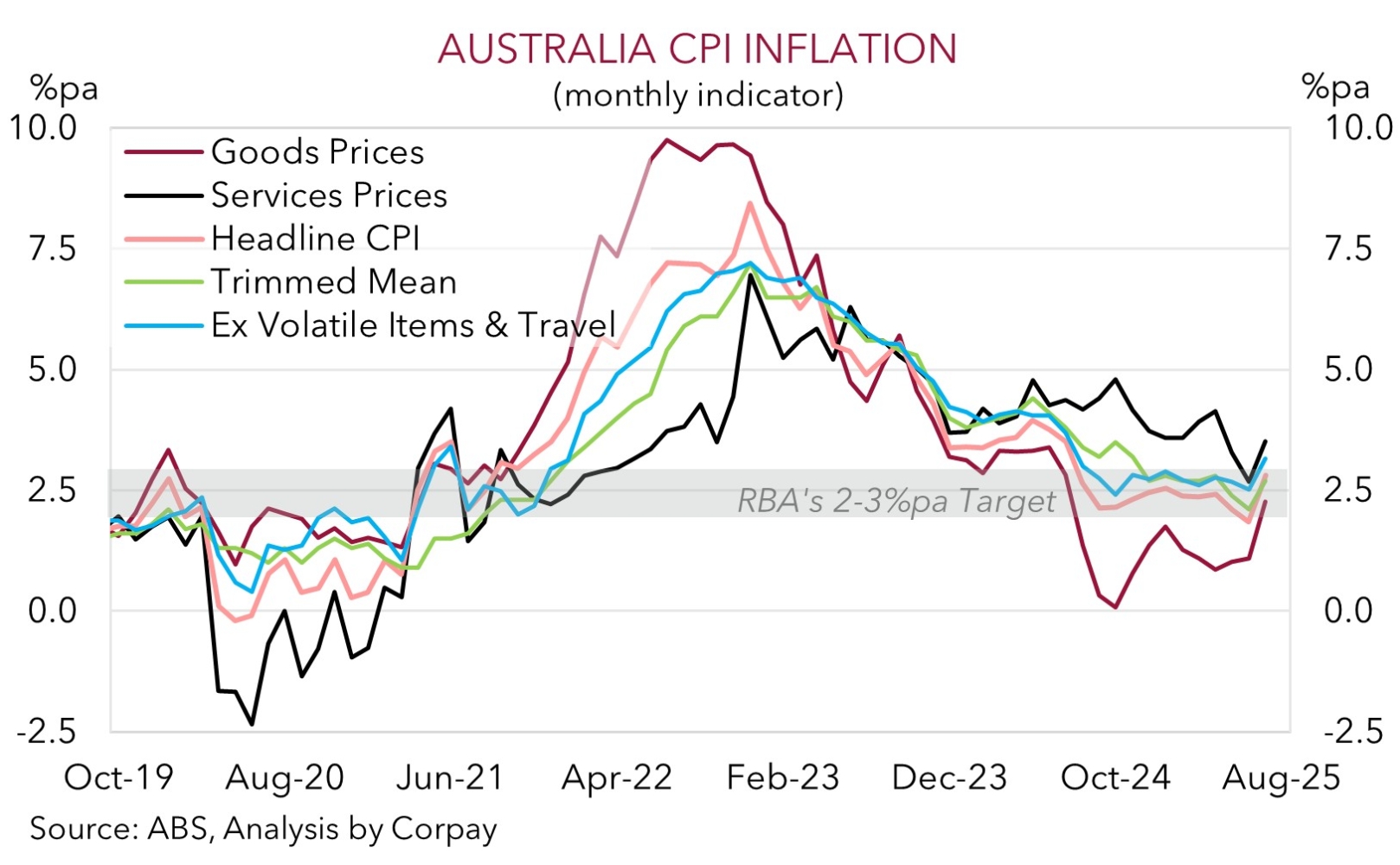 Today the monthly Australian CPI indicator is due (11:30am AEST). This is a partial indicator, however several of the ‘services’ components that are updated once per quarter will be released in the August data. We believe base effects in a few components, particularly around things like electricity subsidies, point to a further re-acceleration in headline inflation (mkt 2.9%pa from 2.8%pa), and pose upside risks to core inflation. In our view signs of firmer Australian inflation pressures could bolster views the RBA remains on a different path to its global counterparts and that further rate reductions should be gradual/limited. The next RBA rate cut now isn’t fully discounted until December with another move after that almost factored in by next June.
