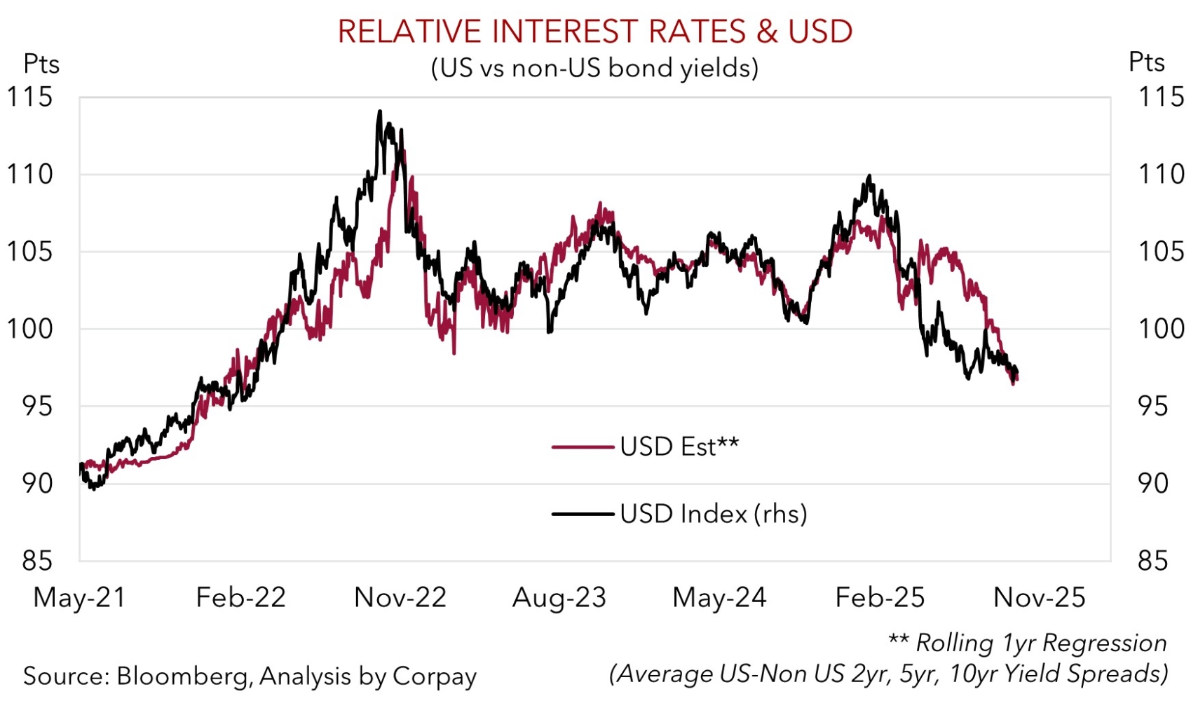 Looking ahead, US durable goods orders (a proxy for business investment) (Thurs) and the PCE deflator (the Fed’s preferred inflation gauge) (Fri) are due later this week. On balance, we expect the USD to continue to consolidate over the near-term. As shown in the chart below, the USD index is close to where our short-run interest rate based regression model suggests it should be. That said, over coming months we believe the combination of slower US growth, lower US interest rates, and/or reduced inflows into US assets should see the USD’s downtrend re-assert itself.