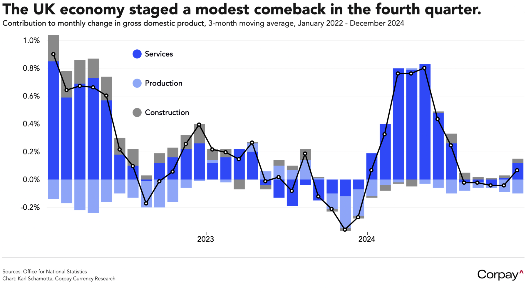 The pound is trading with a firmer bias after the British economy expanded by more than expected in December, helping avert an outright contraction in the fourth quarter. According to updated numbers from the Office for National Statistics, gross domestic product grew 0.4 percent on a month-over-month basis at the end of the year—beating the -0.1-percent consensus estimate—with the services sector doing most of the heavy lifting. But on a full-year basis, inflation-adjusted output in the UK climbed just 0.8 percent in 2024—far short of the 2.8-percent pace hit in the United States over the same period—and rare is the economist who expects this performance gap to narrow substantially over the coming year. The pound’s upside potential remains fairly limited, even as positive rate differentials provide a tailwind.