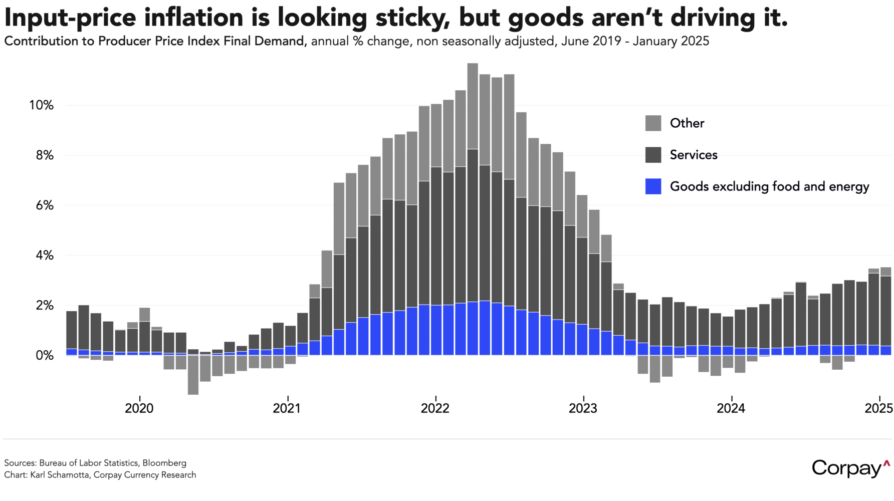 Input price inflation rose at faster pace than anticipated in the United States last month, but details under the hood indicated a moderation in some services categories, suggesting that the Federal Reserve’s preferred inflation indicator could slow in month-over-month terms when it is reported next week. Producer prices for final demand climbed 0.4 percent in January relative to the prior month, topping forecasts for a 0.3 percent increase, and rising 3.5 percent on a year-over-year basis, but airline fares and medical care costs declined, putting pressure on the key components that feed through into the core personal consumption expenditures index. Core goods prices accelerated slightly, rising 0.6 percent versus December’s 0.5 percent print, but exhibited little sign of tariff front-running, indicating that “bullwhip effects” haven’t arrived in the tradable goods sector just yet.