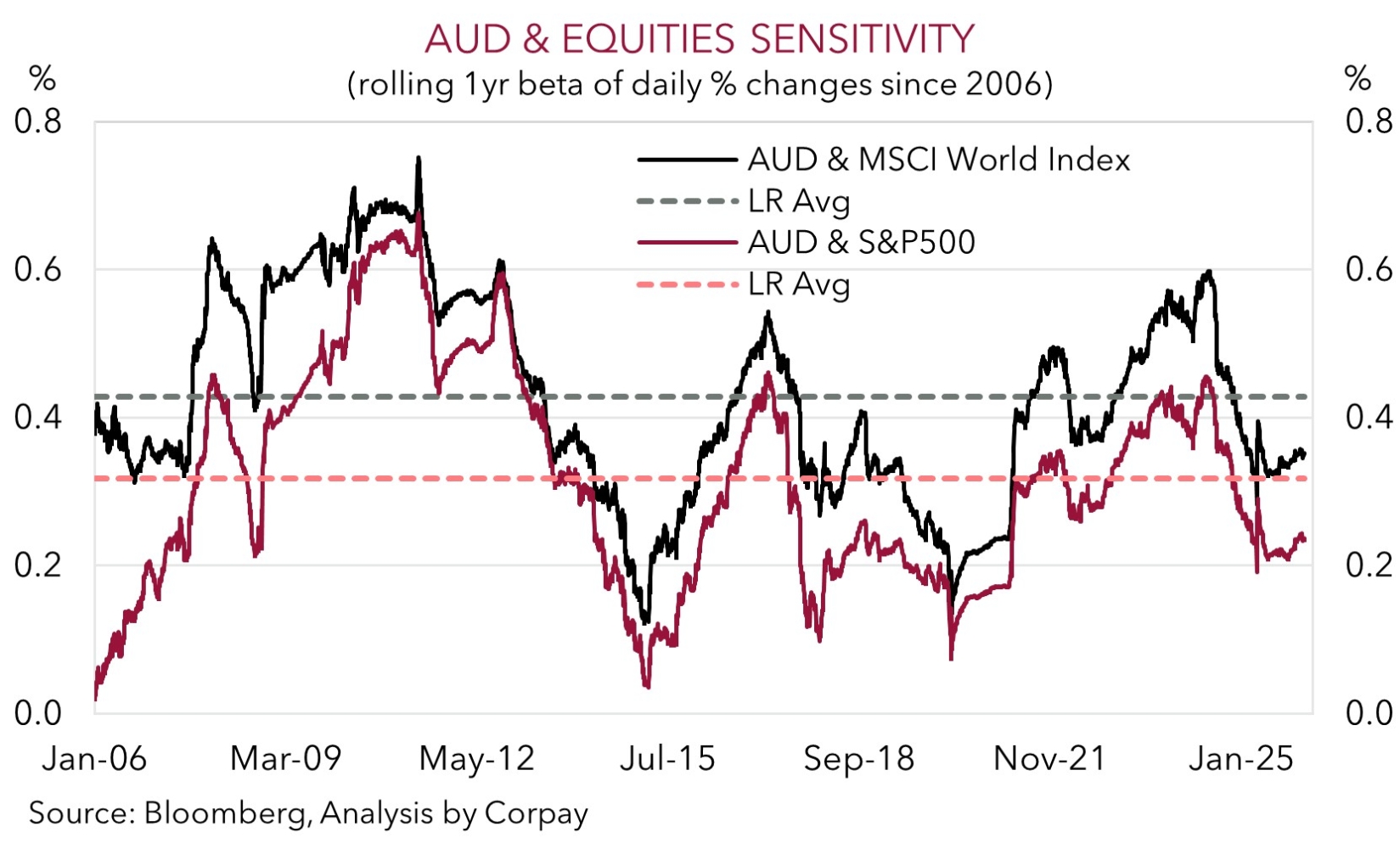 As discussed above, more bursts of US/European headline driven market volatility are possible over the short-term with President Trump appearing at the World Economic Forum and EU leaders holding an emergency summit over the next few days. However, we believe that barring a sharp/sustained bout of risk aversion the impact on the AUD should be minimal. As our chart shows, the AUD’s sensitivity/correlation to US and global equities has declined over recent years. This reflects the shift/improvement in Australia’s net international investment position and capital flow dynamics which means the AUD shouldn’t be as impacted by bouts of market turbulence like it was in the past.