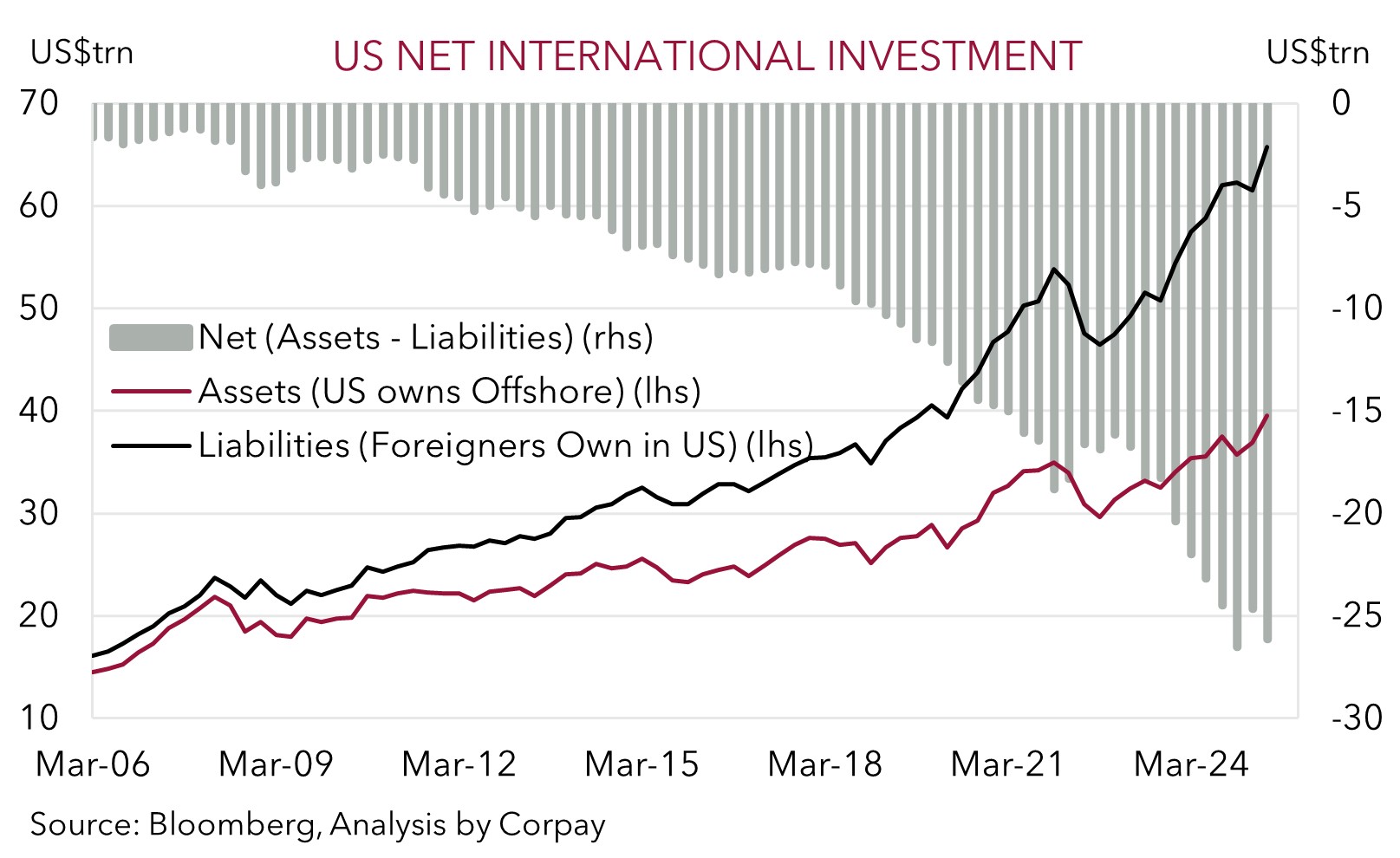 • US pressure points. US reliant on foreigners to fund its obligations. Reduced capital inflows could weigh on the USD over the medium-term.