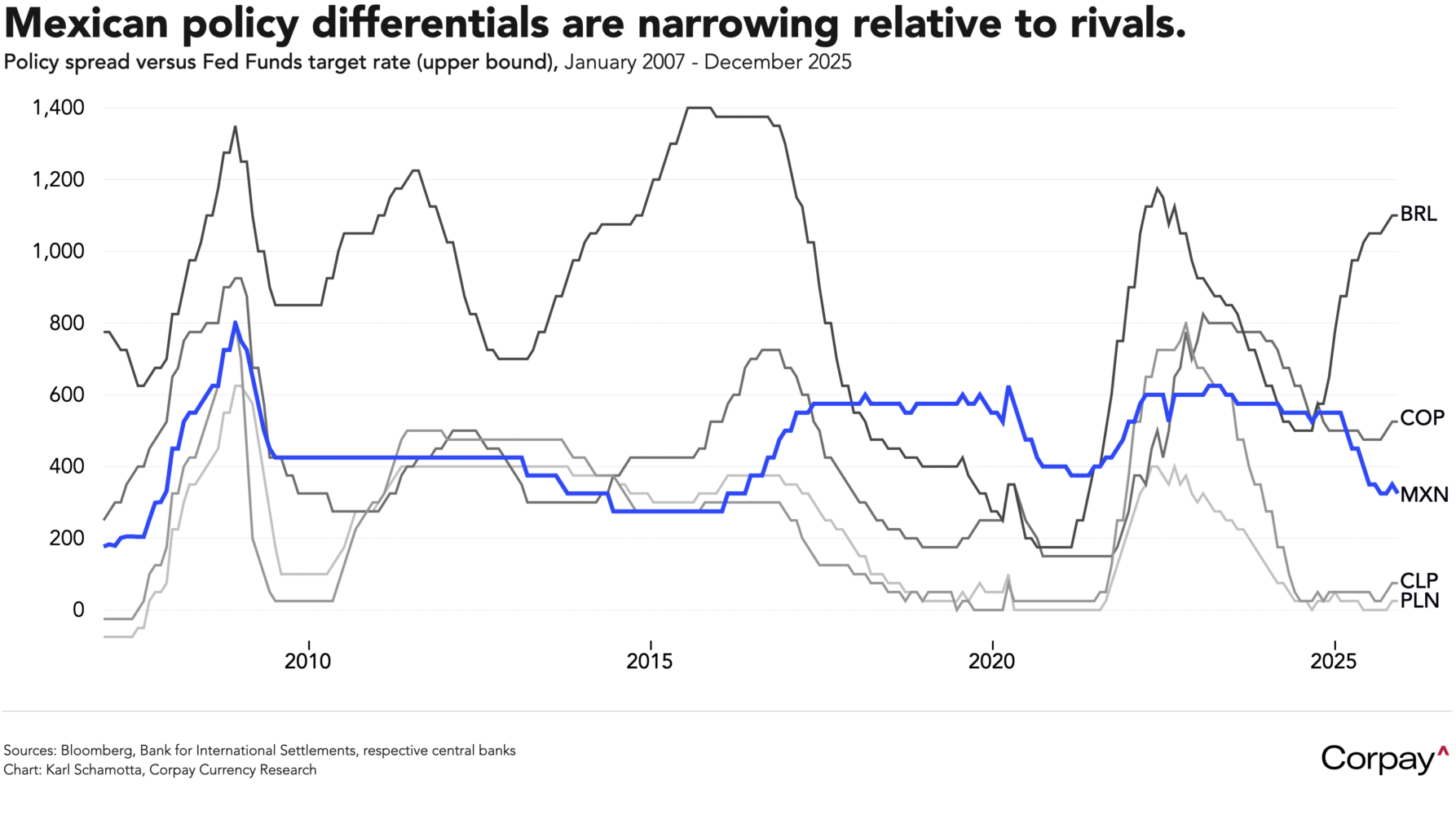 Later today, Mexico’s central bank is expected to pair its own rate cut with statement language that maintains a highly-conditional easing bias. Inflation and inflation expectations remain stubbornly above target and above Banco de México’s own projections, suggesting that officials could take a more hawkish view on the year ahead. But in our view, the case for further rate cuts has strengthened in recent months with net new foreign investment weakening, remittances tumbling, domestic demand slowing, and most measures of activity showing signs of slowing momentum. Disinflation seems likely to resume next year—helped by the peso’s appreciation in 2025, lower oil prices, and declining US rates—and we think the currency’s carry profile could deteriorate relative to some of its emerging-market counterparts, limiting scope for further gains.