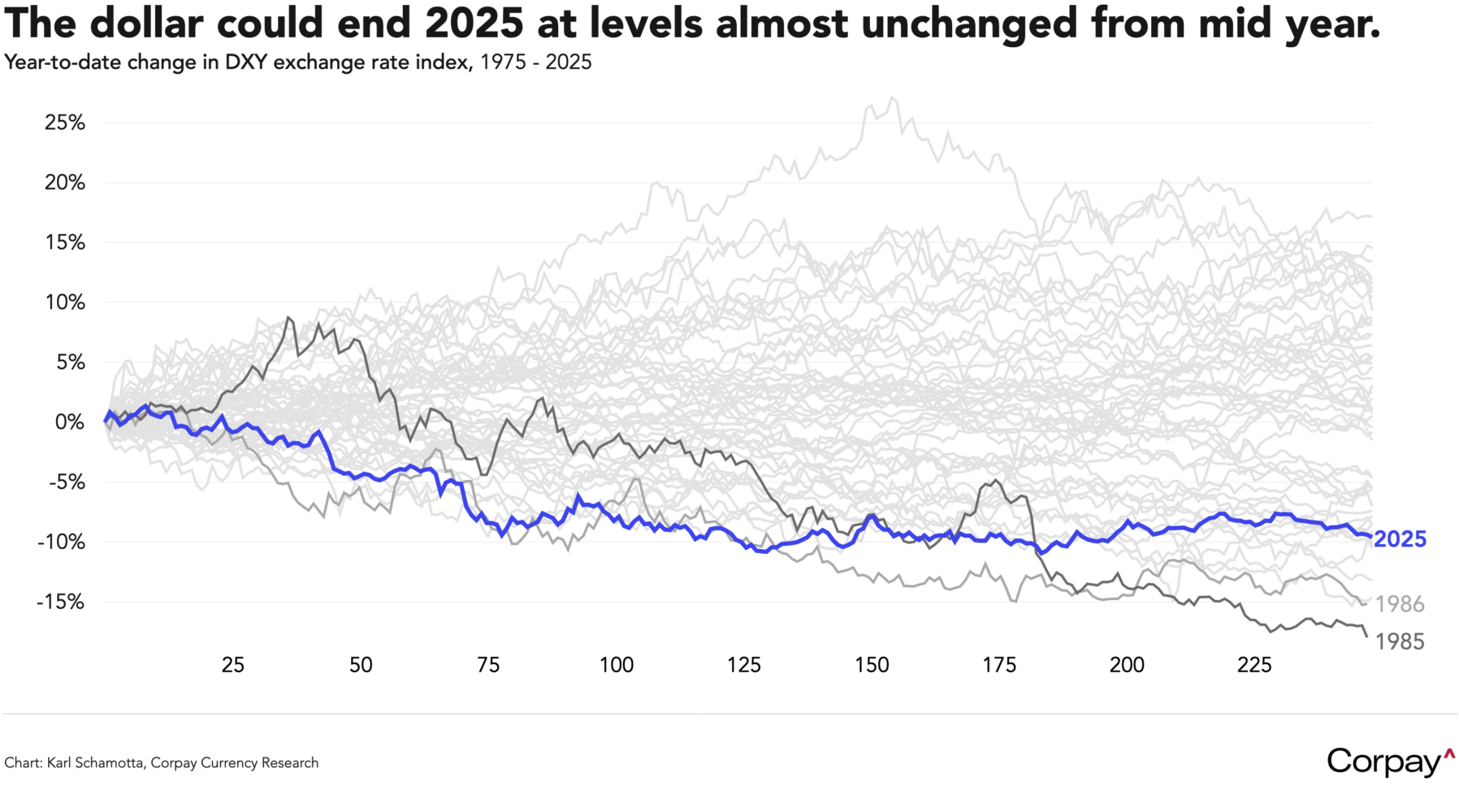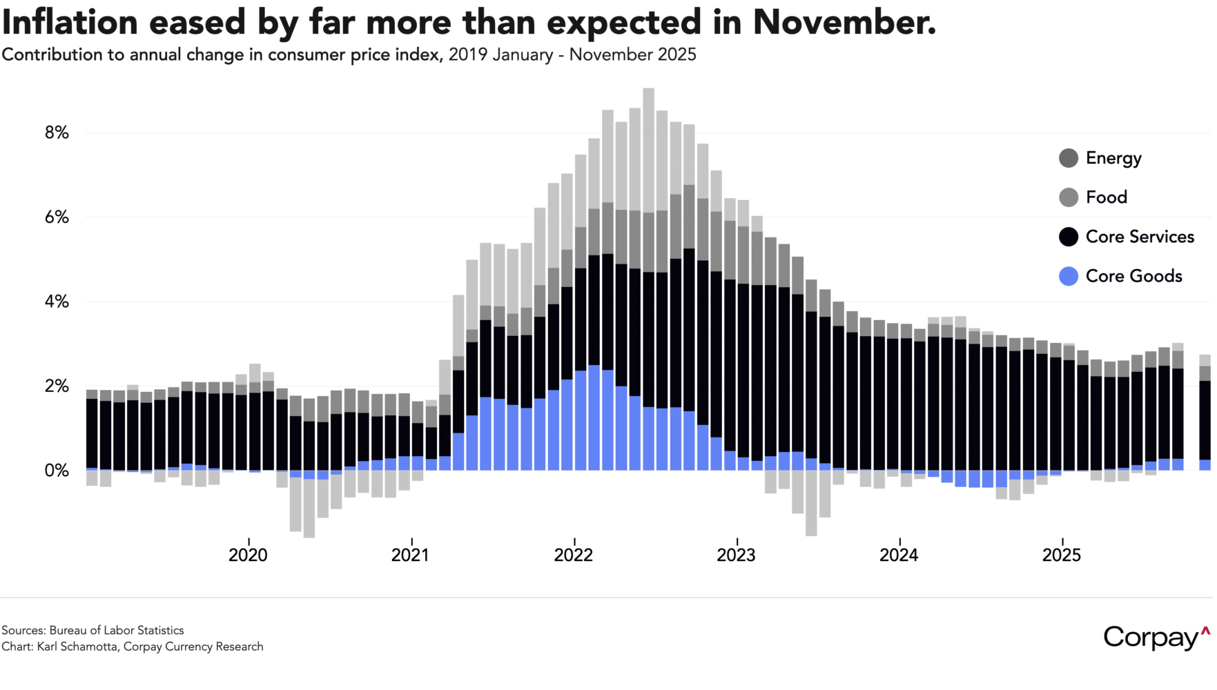 Treasury yields are coming down sharply on the policy-sensitive front end of the curve, equity futures are rebounding from yesterday’s selloff, and the dollar is retreating against its major rivals as traders move to price in a more decisive easing bias from the Fed in the early new year. There are major reasons to suspect that the disinflation narrative might prove short-lived—without October’s data to examine, today’s print could represent a seasonality-driven head-fake—but if this morning’s dynamic holds, the greenback could end the year on the defensive, essentially unchanged from levels reached in the months just after Donald Trump’s “Liberation Day” tariffs damaged the outlook for the world’s largest economy.