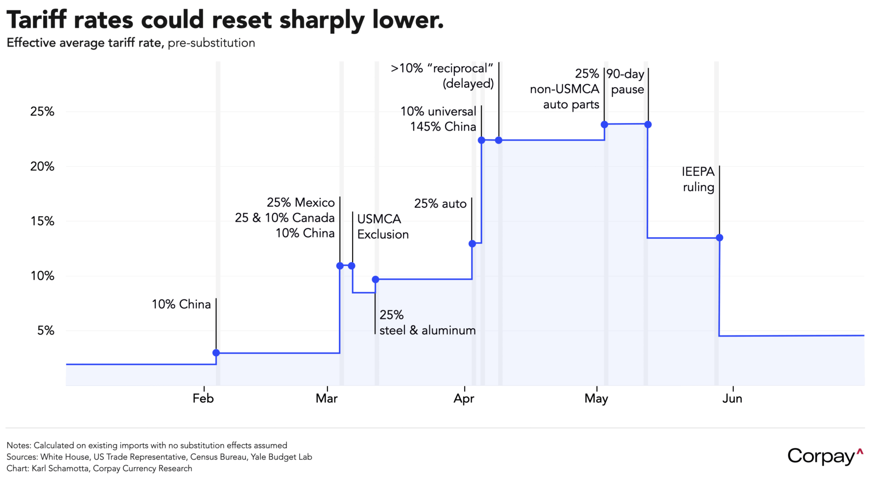 *Please note that modelling effective tariff rates is an inexact science at the best of times, and these, dear reader, are not the best of times. My estimates have changed on more than 30 different occasions this year, but are ultimately based on the trade mix that prevailed in 2024 – which the economy has clearly moved away from. Take them with a very, very large grain of salt.