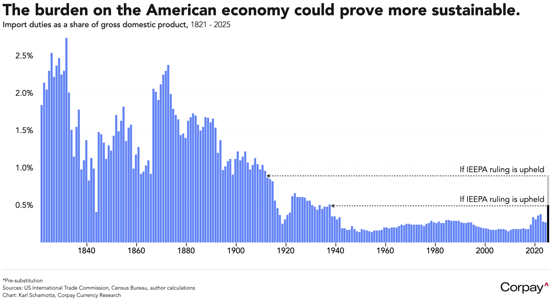 In theory, the ruling could deliver major upside shock to the US and global growth outlooks. If average tariff rates are reset to around 4.7 percent* – roughly double those that prevailed before Trump took office, but down dramatically from what had been threatened last month – the cost imposed on the American economy could shrink to levels that can be sustained over time. The chart below, which (somewhat unconventionally) illustrates import duties as a share of gross domestic product over time, shows that the tax burden would fall to a threshold last reached in the late thirties, as opposed to the pre-First World War levels previously estimated.