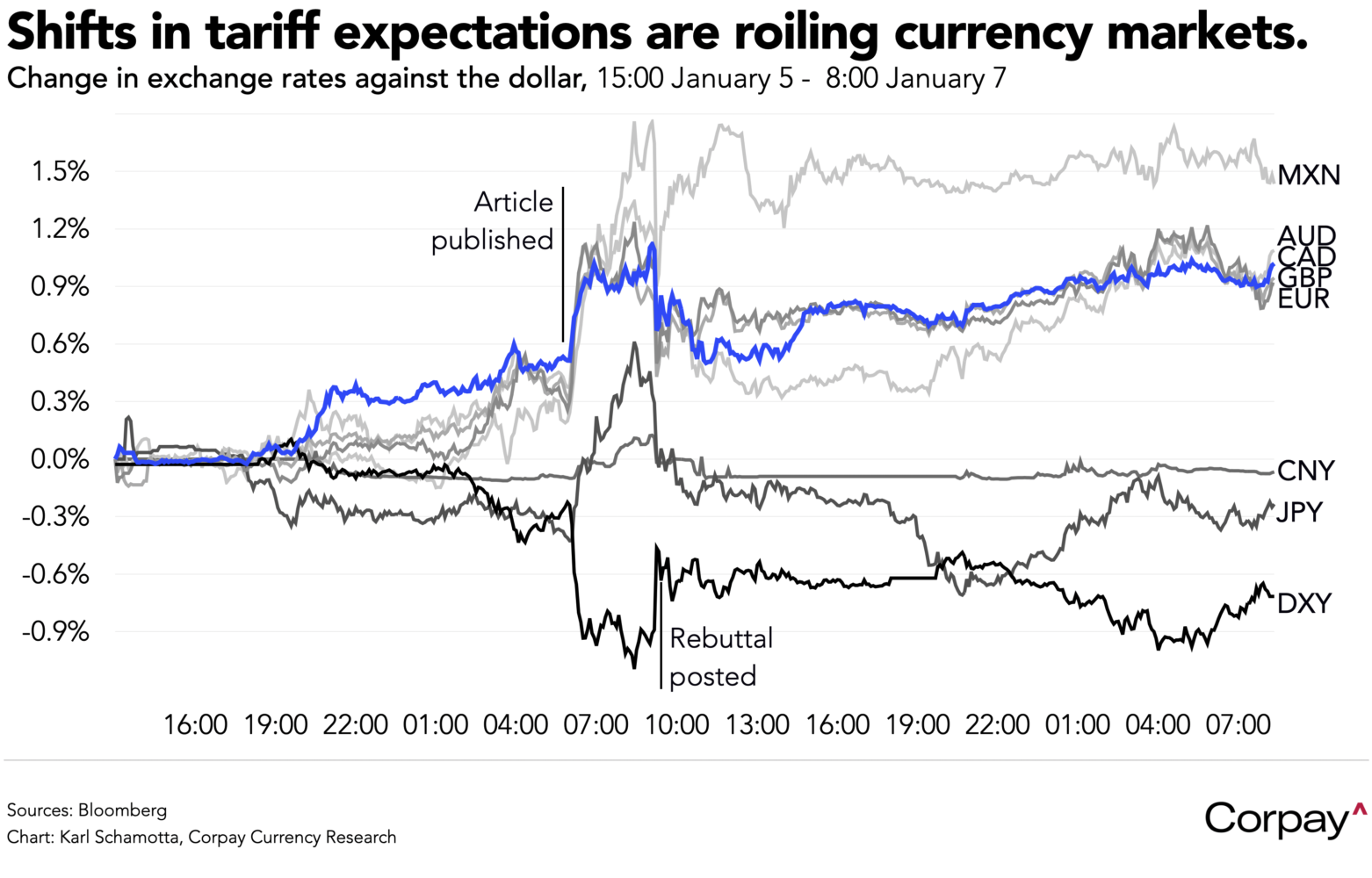 Currency markets are suffering a case of whiplash after Donald Trump yesterday denied a report saying that his aides were exploring plans to implement a narrower set of tariffs than had been promised on the campaign trail. The article in the Washington Post, which suggested that the incoming administration would impose selective rather than universal tariffs, triggered a 1-percent drop in the dollar, but was rebutted a little more than three hours later by the president-elect in a Truth Social post in which he called it “fake news”. The greenback ended the day down roughly 0.7 percent as traders adopted a “where there’s smoke, there’s fire” interpretation, following a playbook established over dozens of similar episodes during the first Trump administration.